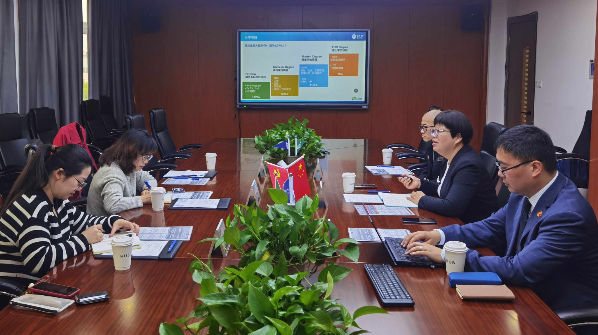 4月23日上午,365上市公司国际部国际合作处副处长/港澳台办公室主任黄培,国际合作处周梁及李婧媛来院进行合作办学调研访问。我院副院长胡笑寒、国际部主任顾浩东、国际部唐定强与来宾在文荟楼409会议室举行了会谈。