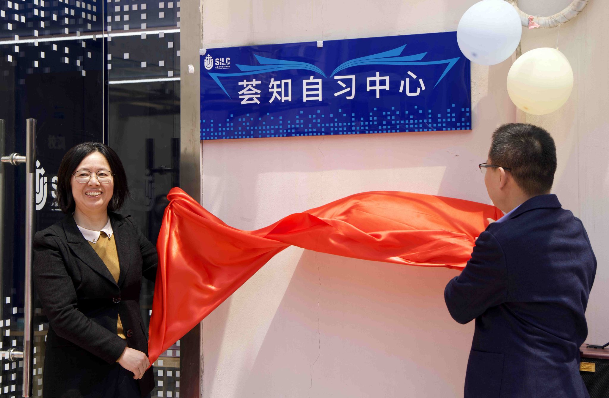 吕康娟和卞亦文共同为学生公寓荟知自习中心揭牌。