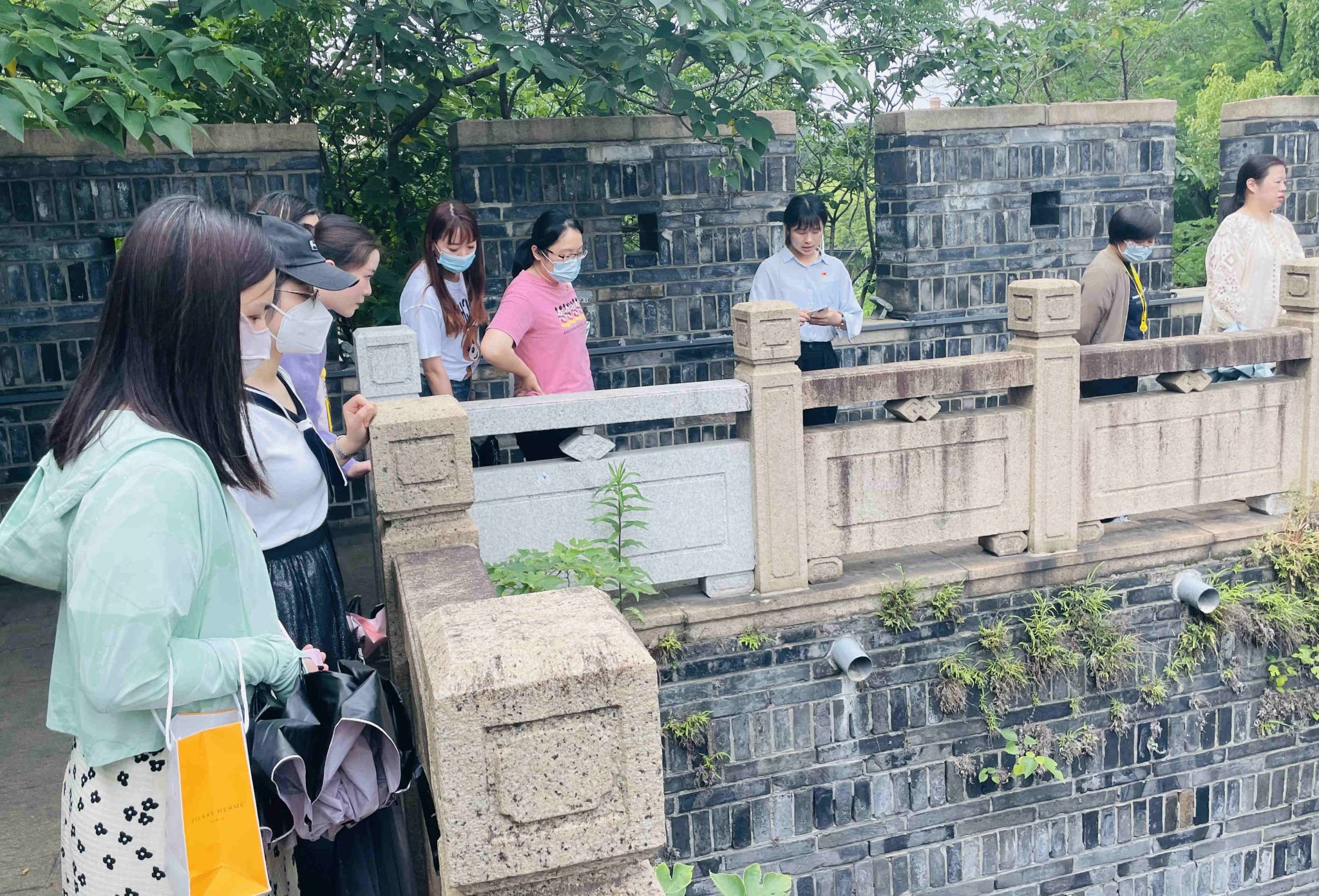 嘉定紫藤园党群服务站位于嘉定紫藤园内,是嘉定环城河五个特色党群服务站之一。它不仅是市民游客的休息驿站,平日提供热水、充电、公益咖啡等便民服务;而且是党群服务阵地,每月“活动菜单”琳琅满目。在党群服务中心,处处可以找到带有温度的“时光印记”——桌子上放着收集百姓 “锦囊妙计”的小木箱;柜子里放着周边居民的工艺作品;《值班记录册》里不同笔记记录着站点情况……通过党群服务站宣讲员滕宜玮的介绍,行政第一、第二党支部的党员们对嘉定区嘉定镇街道服务党员群众和基层党组织的新思路及新举措有了更生动的了解。 在宣讲员带领下,大家继续参观“疁城步‘史’三部曲”系列互动党课之环城河印迹。环城河印迹是在深入贯彻落实党的二十大精神、进一步延续党史学习教育成果的大背景下,结合环城河步道的优势资源和沿线南城墙、南水关、现厂等历史人文景观,通过带领大家实地考察文化遗址,聆听历史事件和故事,寓学于景,沉浸式体验“八百年古疁”年轻的新模样,让党员群众们在实践中感悟“以史为镜,可以知兴替”的古训。在参观过程中,宣讲员结合二十大精神及参观介绍内容设置了问答环节,并向答对问题的同志赠予了小纪念品。