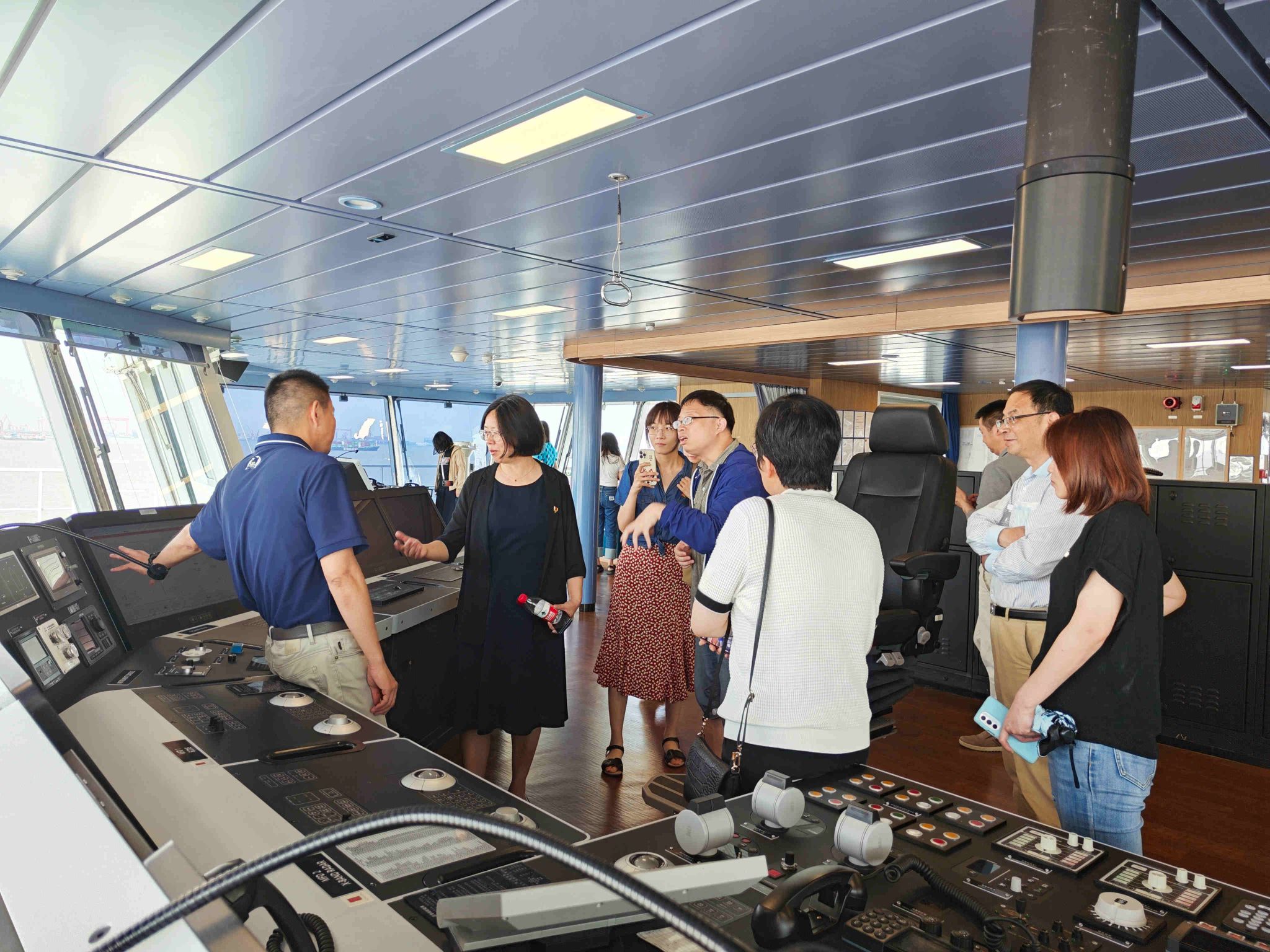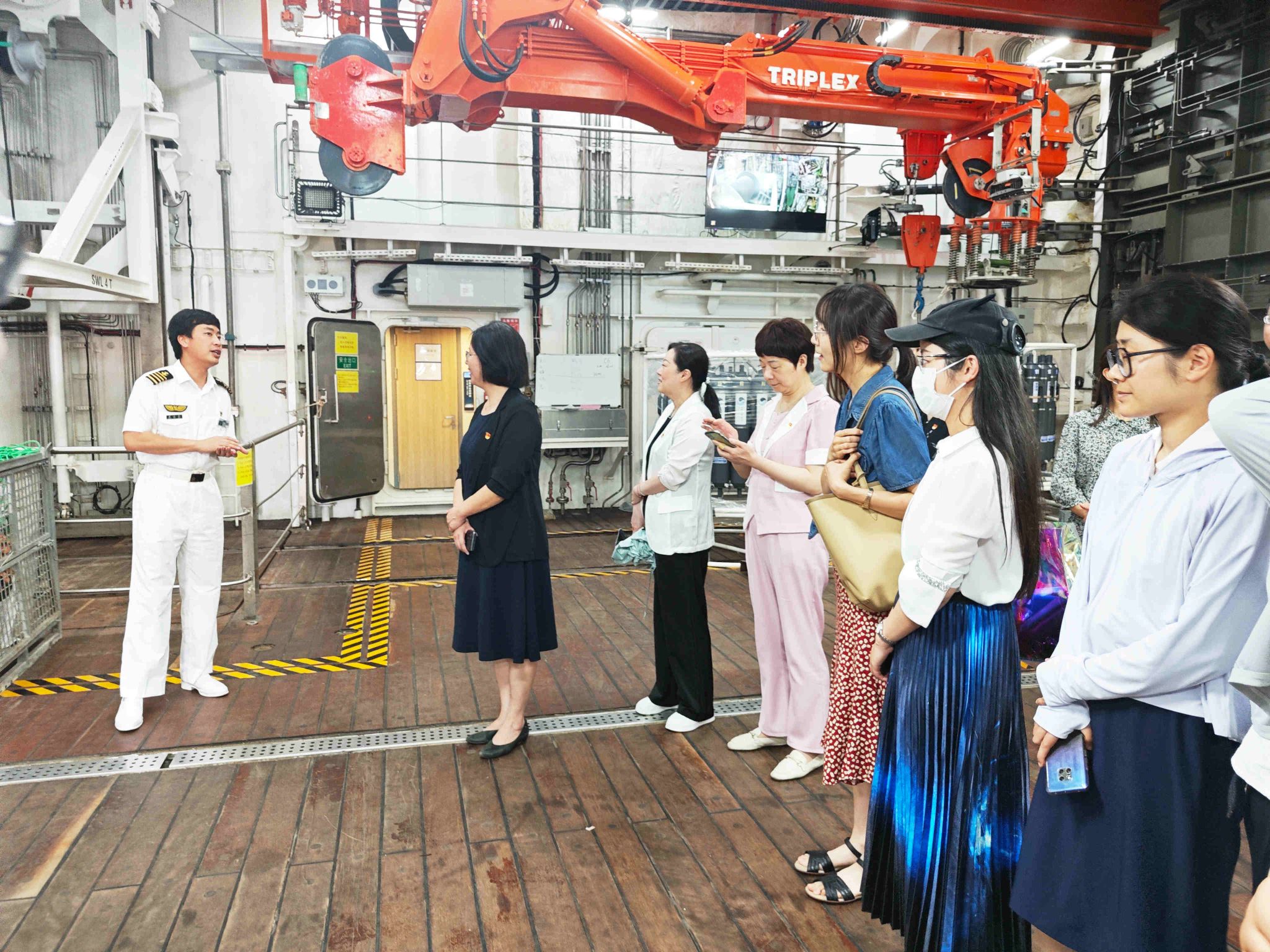 在黄嵘院长的引导下,吕康娟书记一行登上停泊在中国极地研究中心港口岸边的"雪龙2"号极地考察船,观看了讲述2022年最新一次该船南极科考进程和收获的专题纪录片,并依次参观了船上的科学实验室、会议室、餐厅、健身房、放映厅、科考专家寝室、直升机停机坪,还进入位于全船最高处九层甲板的驾驶控制室,现场聆听了关于这艘我国目前最先进的极地科考船各方面情况的详细讲解。
