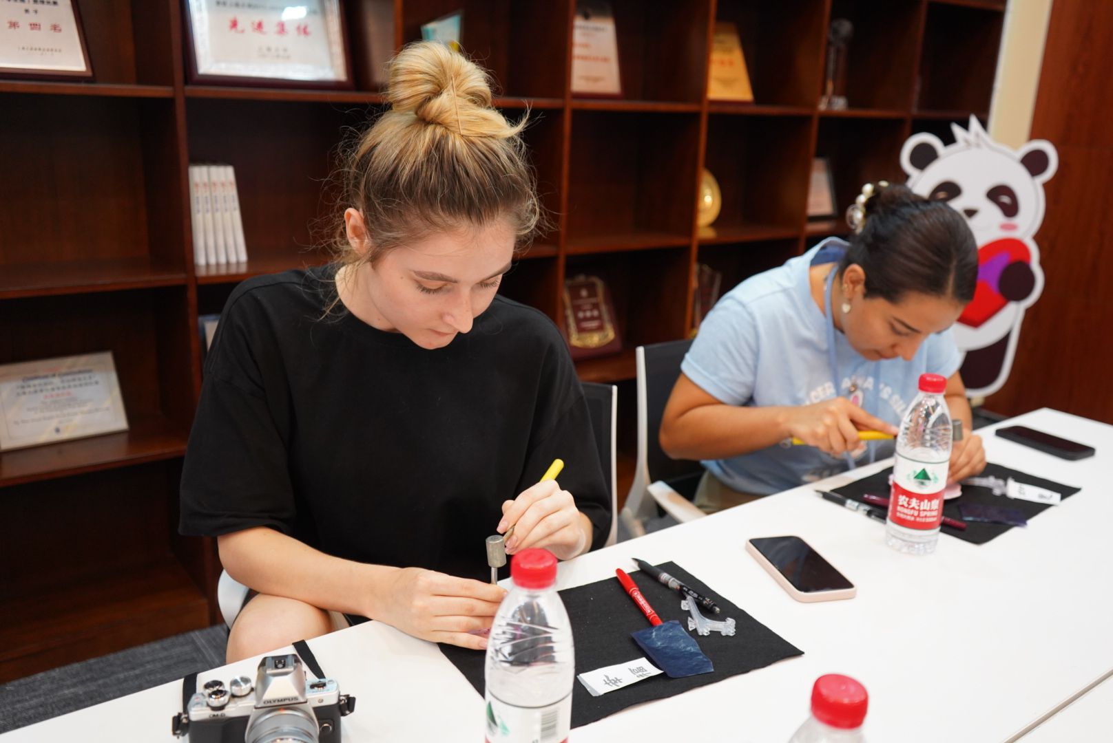 卢老师为同学们准备了许多适合中秋佳节的美好词语,“美满、如意、团圆、相思、如愿、常乐、思念、幸福、欢喜、清欢”等等,中外学生们抱着自己对中秋佳节的美好期许选择了其中一个,开始瓷刻体验。