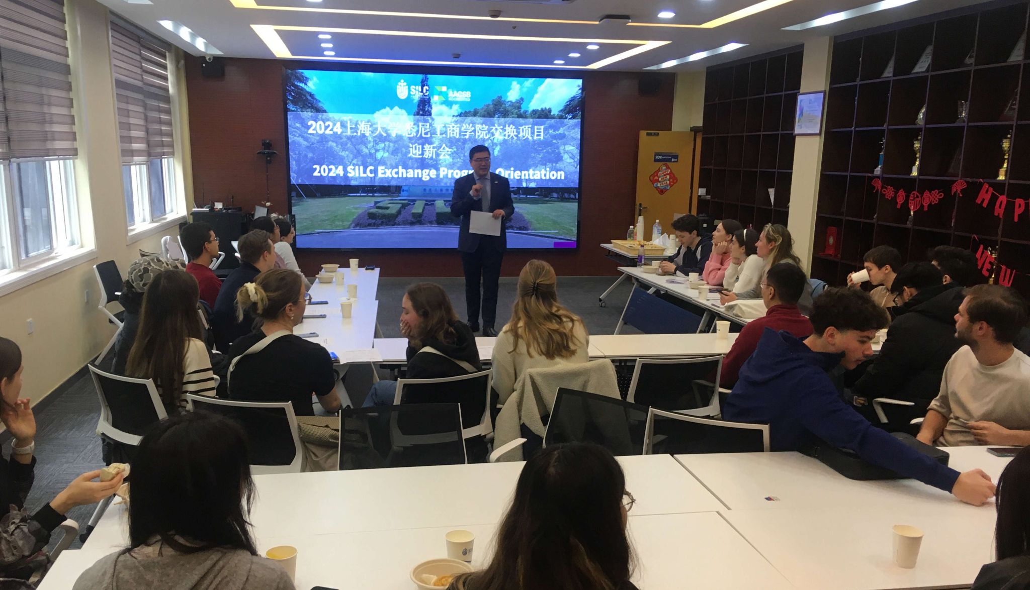 顾浩东主任对加入SILC大家庭的交换生表示热烈欢迎。他向同学们阐述了学院课内课外培养相结合的教育理念,介绍了完善的英文课程建设和丰富多彩的课外活动,勉励学生们充分利用交换学习的机会,从商业、文化、经济等多个角度了解中国。