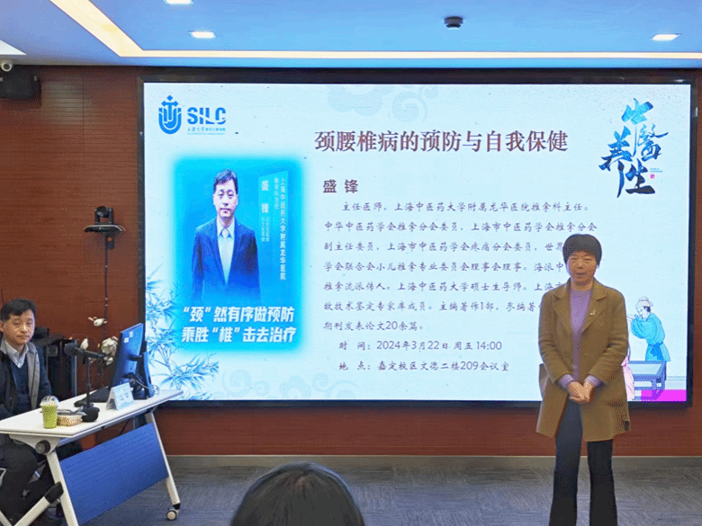 本次讲座特邀了上海中医药大学附属龙华医院推拿科主任盛锋。盛医生是中华中医药学会推拿分会委员,上海市中医药学会推拿分会副主任委员,上海市中医药学会疼痛分会委员,世界中医药学会联合会小儿推拿专业委员会理事会理事。海派中医丁氏推拿流派传人,上海中医药大学硕士生导师,上海市医疗事故技术鉴定专家库成员,主编著作1部,参编著作3部,核心期刊发表论文20余篇。盛医生有着丰富的临床经验,擅长以手法为主治疗颈椎病、颈性眩晕、腰椎间盘突出症、腰肌劳损、肩周炎、骨关节炎等系列相关疾病。盛医生在讲座中为教师们讲解了脊柱的构造和容易造成的伤害,提出了预防保健切实可行的建议,强调日常防治十分重要,要注意纠正日常生活中脊柱过度疲劳的不良习惯,大家受益匪浅。随后,盛医生与老师们进行了互动,对大家提出的问题进行细致耐心的现场指导和解答。