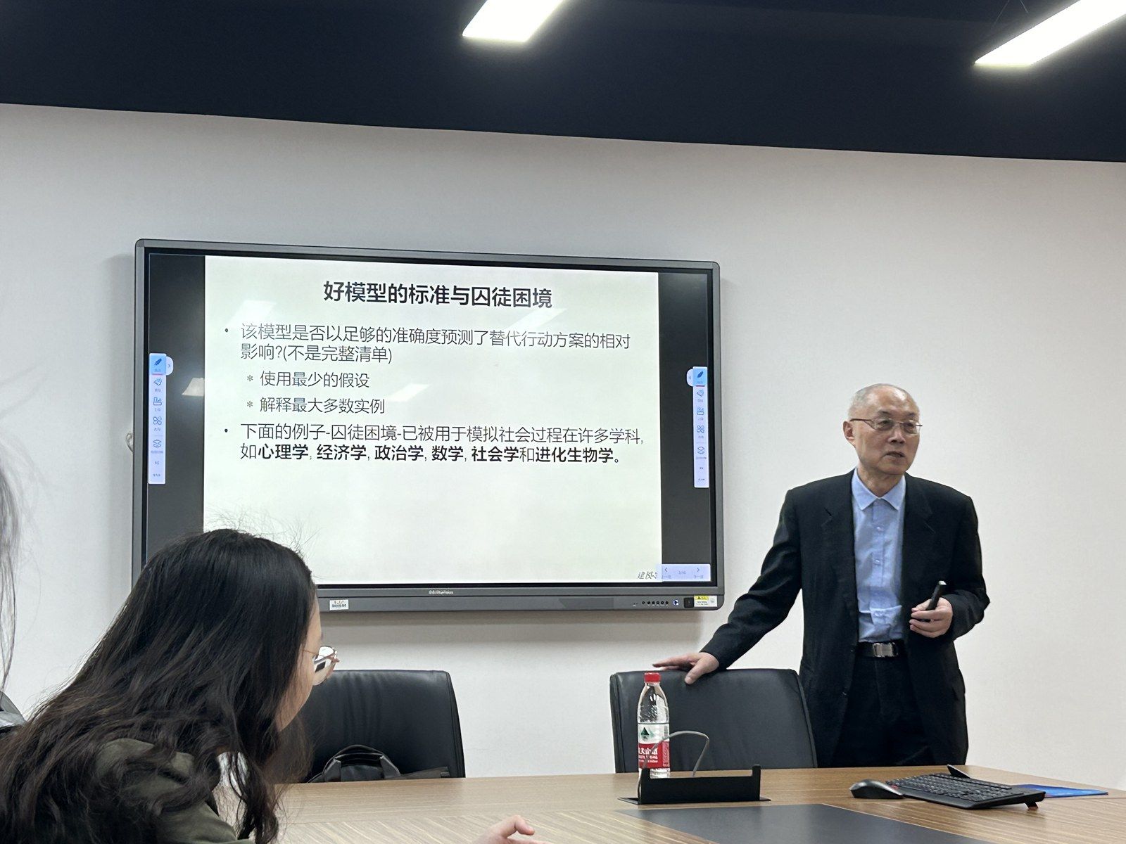 本次讲座孙老师主要向我们展示了什么是模型和如何构建一个好的模型的导言,接着通过囚徒困境的故事来阐释合作演变的三个概念,包括稳健性、稳定性和初始可行性。此外,孙老师通过计算机仿真对不同策略进行竞赛,发现TIT FOR TAT (一报还一报策略)获得了第一名,并阐述了这一策略成功的原因。最后,孙教授通过这一策略给予了参与者和改革者相关的建议。 在讲座临近尾声之时,在场的学院师生同孙老师进行了积极的互动,大家向孙老师就本次讲座中的一些问题提出疑问和看法,并向孙老师请教一些关于博弈论方面的问题,孙老师都逐一进行耐心的解答和探讨。本次讲座的顺利开展,开拓了老师和同学们的学术视野,让同学们学习良多,收获颇丰。 |