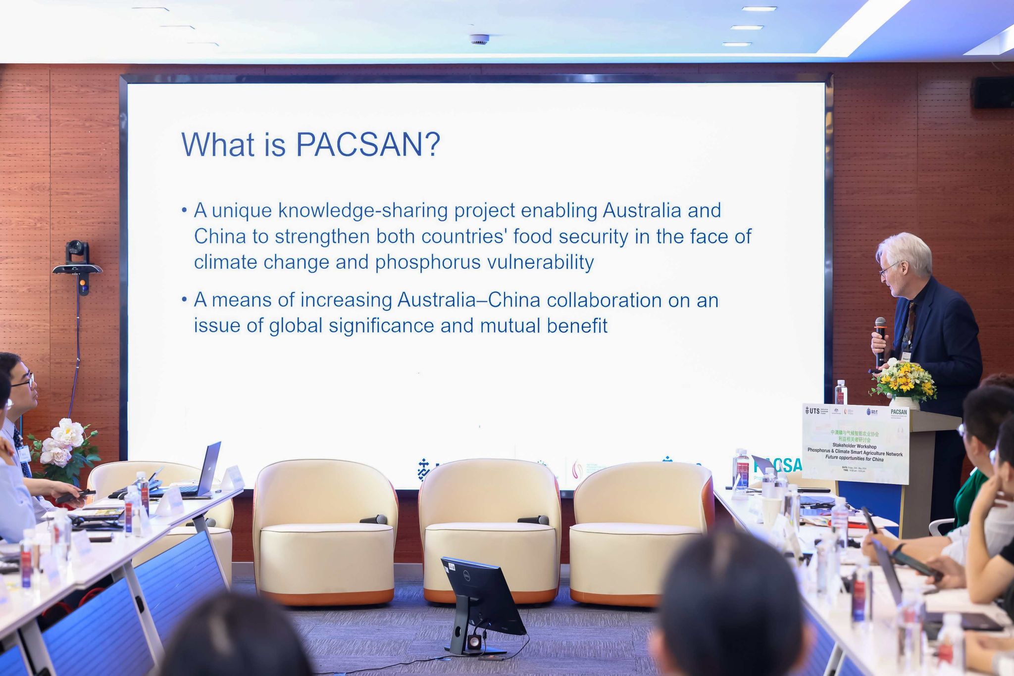 Stuart White教授和Dana Cordell副教授详细介绍了PACSAN项目,该项目由澳大利亚外交贸易部提案的澳中基金会资助,旨在汇集中澳两国的食品系统研究人员和利益相关者,共享知识并制定应对气候变化和磷稀缺对食品供应挑战的策略。Dana Cordell副教授讨论了农业和食品价值链在全球温室气体排放中所占比重之大,以及磷肥使用所面临的有限原材料、高风险和成本上升等问题,强调转型食品系统的必要性及其对食品安全和水质改善的积极影响。