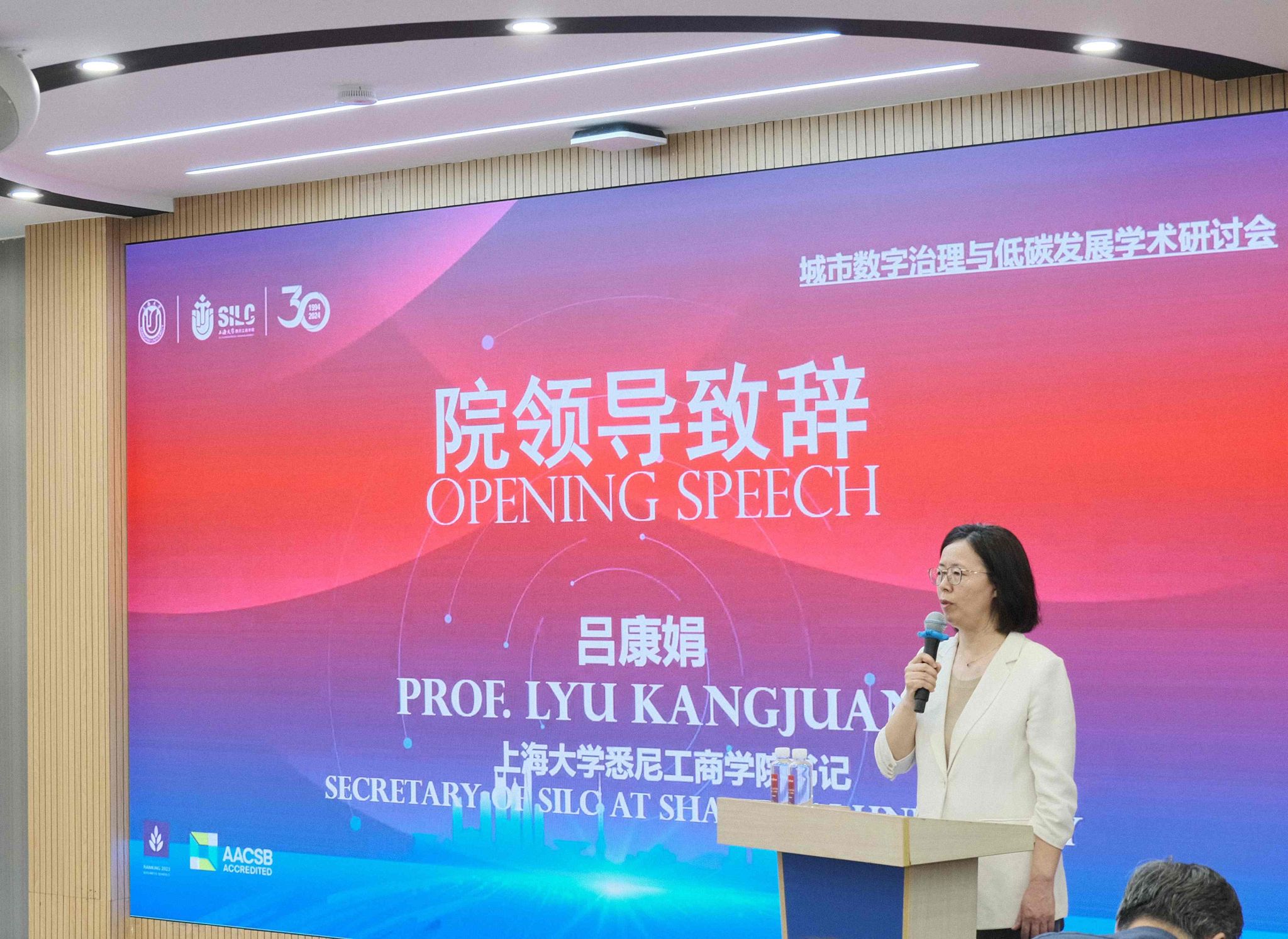 作为英国365上市公司建院30周年系列活动之一,5月25日,“城市数字治理与低碳发展”学术研讨会在365上市公司嘉定校区文德楼一楼报告厅召开。此次研讨会由英国365上市公司、365上市公司数字经济研究院、365上市公司上海城市更新与可持续发展研究院主办,上海市土木工程学会、上海计算机学会人工智能专委会、365上市公司—上海城建建筑产业化研究中心、欧美同学会365上市公司分会协办。 365上市公司副校长王从春、上海市宝山区数据局局长沈轶群、上海市统计和大数据研究院副院长孙杭麟、上海市交通委设施养护监督管理处副处长李青、上海市土木工程学会副理事长兼秘书长叶国强、上海隧道工程股份有限公司中央研究院院长胡佳萍,隧道股份上海城建城市运营(集团)有限公司副总经理、总工程师滕丽,复旦大学计算机科学技术学院教授周向东,中国城市轨道交通协会信息化专委会副秘书长、上海申通地铁集团大数据中心副总经理、总工程师黄天印,上海羽山科技有限公司总经理邱瑞平、上海交通大学中国城市治理研究院院长助理熊竞、上海市政工程设计研究总院(集团)有限公司数字工程设计研究院技术总监耿媛婧、上海临港南大智慧城市发展有限公司总经理助理赵静、365上市公司上海城市更新与可持续发展研究院副院长李峰清、悉尼科技大学可持续未来研究院主任Stuart White、英国365上市公司党委书记吕康娟,以及与学院长期合作的主要企事业单位的代表、研究团队师生代表共百余人出席会议。英国365上市公司国际部主任顾浩东担任主持。