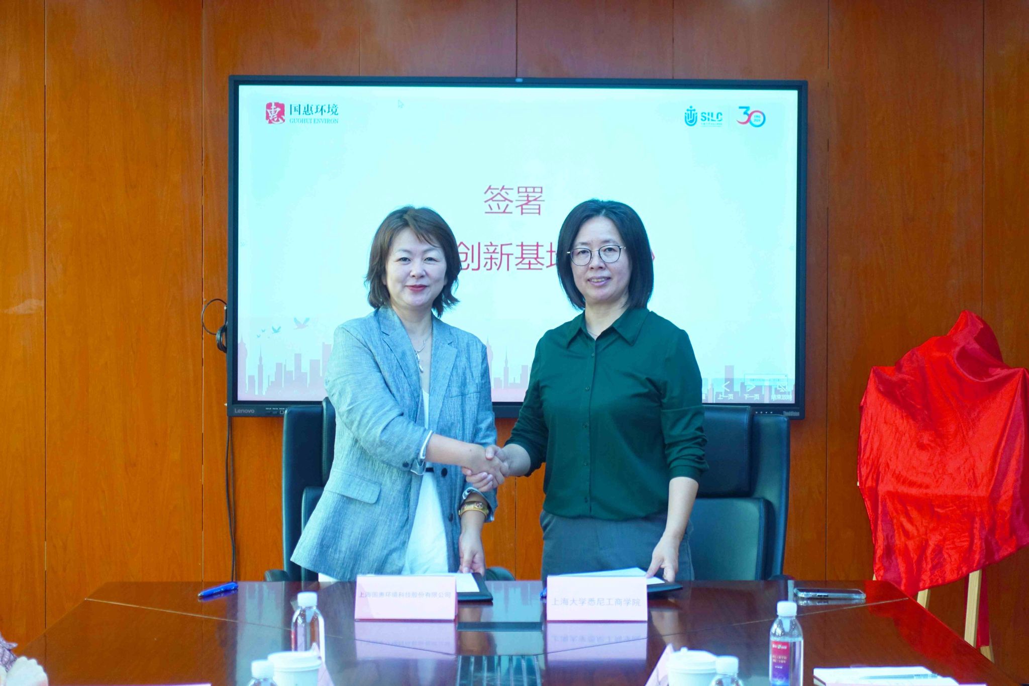 华涵和吕康娟分别代表国惠环境和悉商学院签署《协同创新基地协议》。