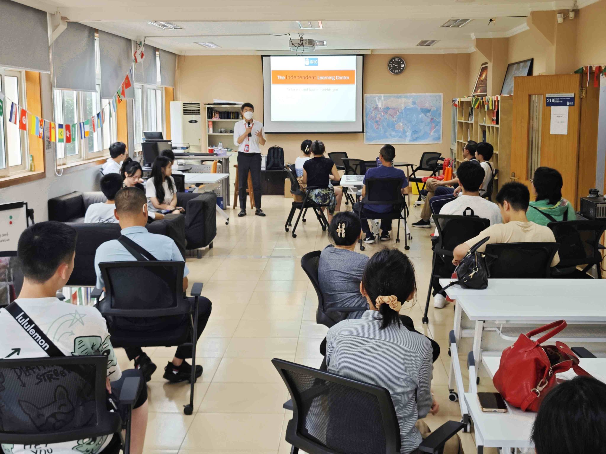 宣讲会结束之后,导生带领高考考生及家长来到ILC(Independent Learning Center,自主学习中心)了解悉商独特的学术英语课程。学院英语系的武星老师以AE(Academic English, 学术英语)系列课程为切入点,向考生及家长介绍了悉商学术英语课程和ILC的必要性与优势,展现了全面的悉商英语学习风貌。家长和高考考生们在武星老师的讲解中感受到了悉商的浓厚学术氛围。