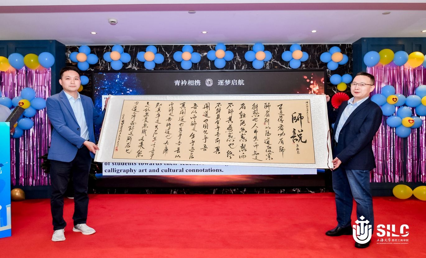 毕业生胡沛源向学院赠送自己书写字画,管子房、王子昊、田杰、关之歌、魏新良、胡东平等代表2024届UTS硕士毕业生向学院捐款,卞亦文院长代表学院接受毕业生捐赠。