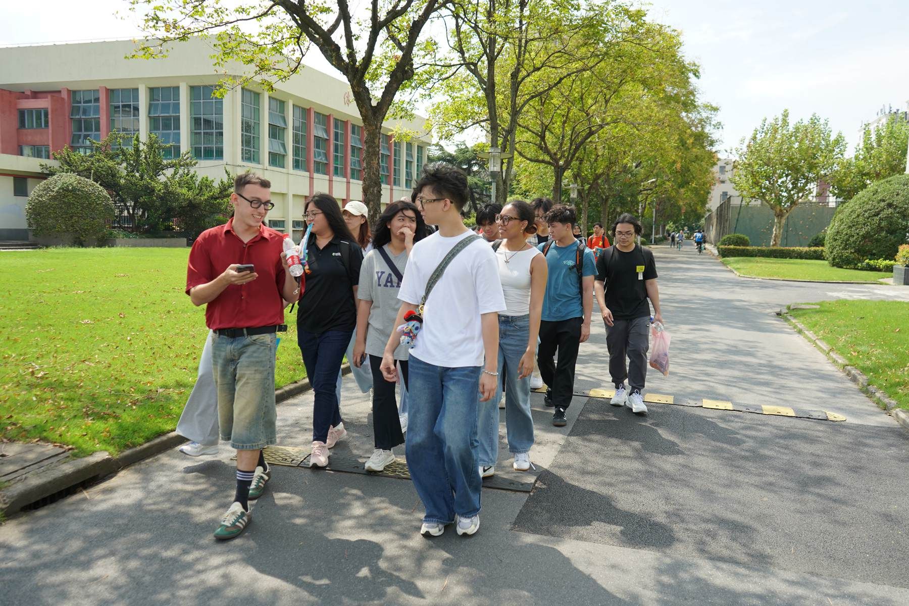 随后,中外师生走出教室,在文荟广场的绿地上留下了珍贵的合影。在SILC学生代表的带领下,大家漫步校园,惬意地享受着秋日的暖阳和微微的秋风。SILC学生代表兴奋而又自豪地带着大家穿过校园里的设施建筑、花草树木。“这是我们上课的教学楼”“这是我们的食堂,二楼的烧烤超级好吃!”“这是我们的操场,你经常可以看到中外学生们一起打篮球”“这是我们学校里的小猫,他们正懒洋洋地睡午觉呢”……RP的学生们拿起照相机,新奇而又兴奋地记录着校园里的一切:慵懒自在的猫猫学长、盘根错节的百年松树、欢声笑语的同学们……秋风吹不散校园里的欢声笑语。SILC与RP的同学们虽只是第一次相见,却一见如故,谈笑风生。SILC的好有那么多,三言两语怎能轻易说完。 Afterward, the students and teachers stepped outside and left a group photo on the green lawn of Wenhui Square. Led by student representatives from SILC, the group strolled through the campus, enjoying the warmth of the autumn sun and the gentle breeze. SILC student representatives excitedly and proudly introduced various campus facilities, plants, and buildings: “This is our teaching building,” “This is our canteen, and the barbecue on the second floor is super delicious!” “This is our sports field, where you can often see local and international students playing basketball together,” “These are our campus cats, lazily napping in the afternoon sun.” The RP students, full of curiosity and excitement,recorded everything through their cameras: the cats, the century-old pine trees, and the lively students. The autumn breeze did nothing to dampen the laughter and joy that filled the campus. Despite their first time meeting, the students from SILC and RP hit it off instantly, chatting and laughing together.