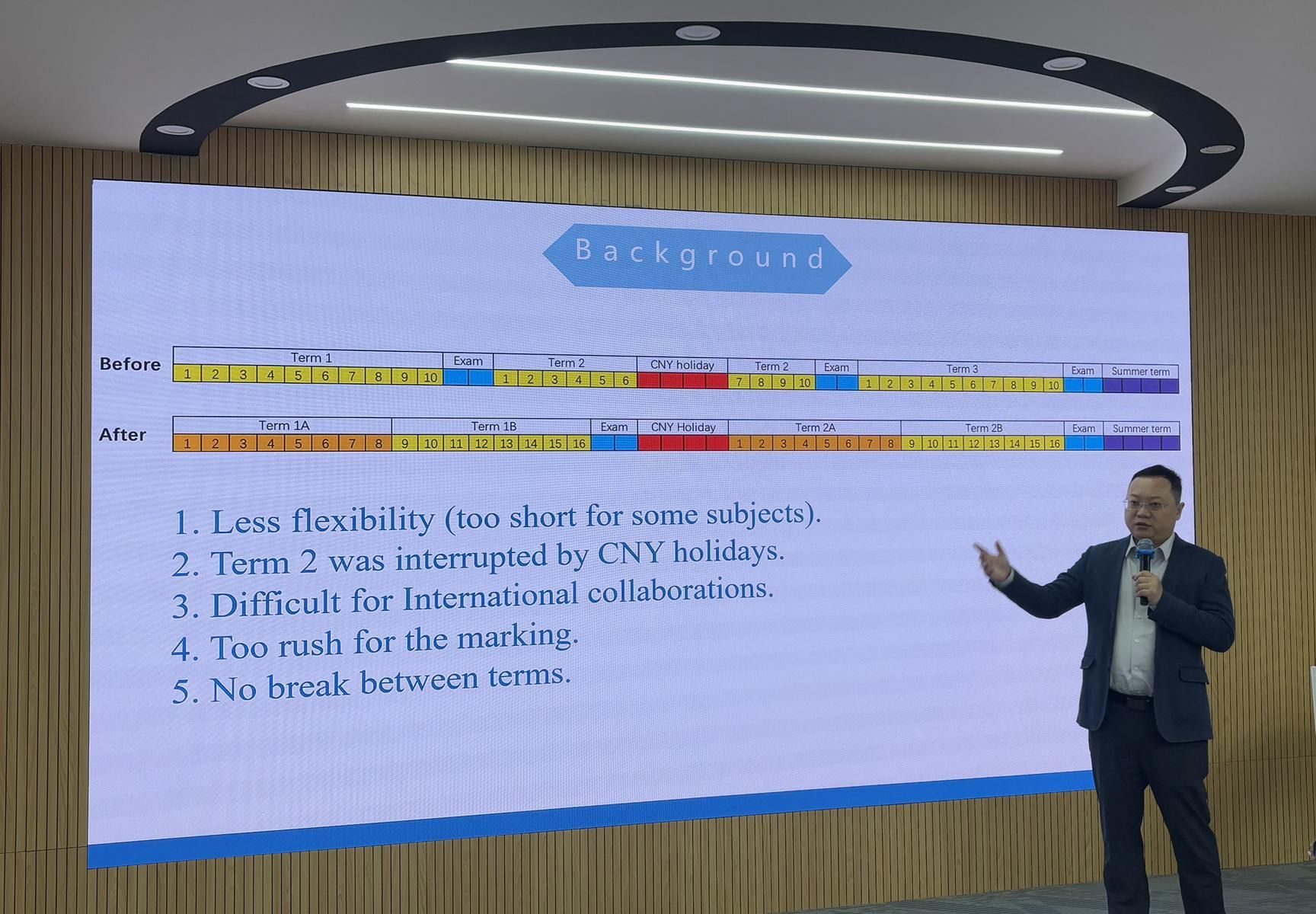 活动伊始,学术英语总监理查德·马登(Richard Madden)报告了冬季学期各门英语课程的教学成果,并深入分析了各课程的成绩分布情况。Richard还重点讨论了学校学期制优化改革,详细阐述了改革背景下课程安排及教学安排可能发生的变化,为教师们提供了明确的指导方向,助力教学团队提前做好规划与准备。
