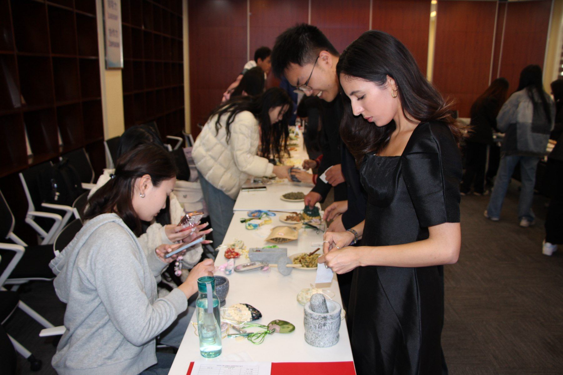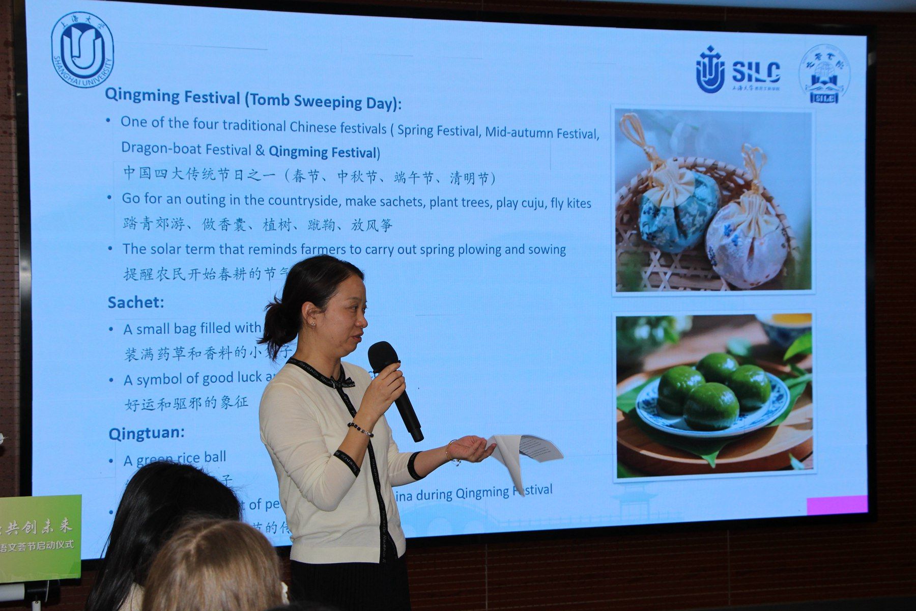在“中西荟萃”文化介绍环节,旷群向中外学生娓娓道来清明节的古老起源、丰富背景、独特习俗、美味传统食品以及相关的汉语词汇。她介绍,清明节是中国四大传统节日之一,同时也是二十四节气之一,距今已有两千五百多年历史,人们通过踏青、扫墓、插柳、做香囊、吃青团等,表达情感寄托。中外学生通过旷老师的介绍深入了解了清明节的习俗和文化内涵,深刻感受到了中国传统文化的博大精深和独特魅力。