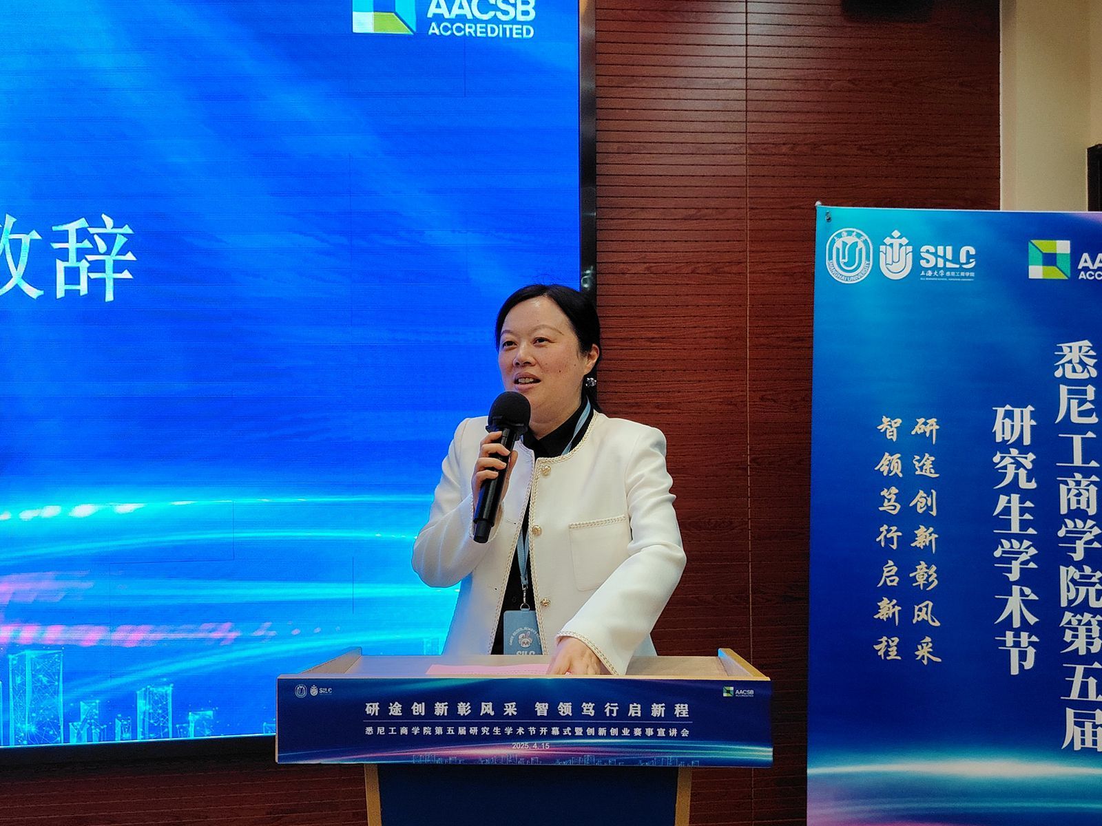 方慧副院长为本届研究生学术节致辞。她围绕“顶天”“立地”“顺势而为”等三个关键词展开深入阐述,鼓励研究生勇攀科技前沿,切实将学术研究与社会实际紧密结合,积极拥抱新技术、新思想。她强调,学院正积极推动商科数字化转型,为学生创造更多机遇,期待同学们能在学术研究和实践中实现从跟跑到领跑的跨越,把所学知识充分运用到社会发展中,贡献智慧和力量。