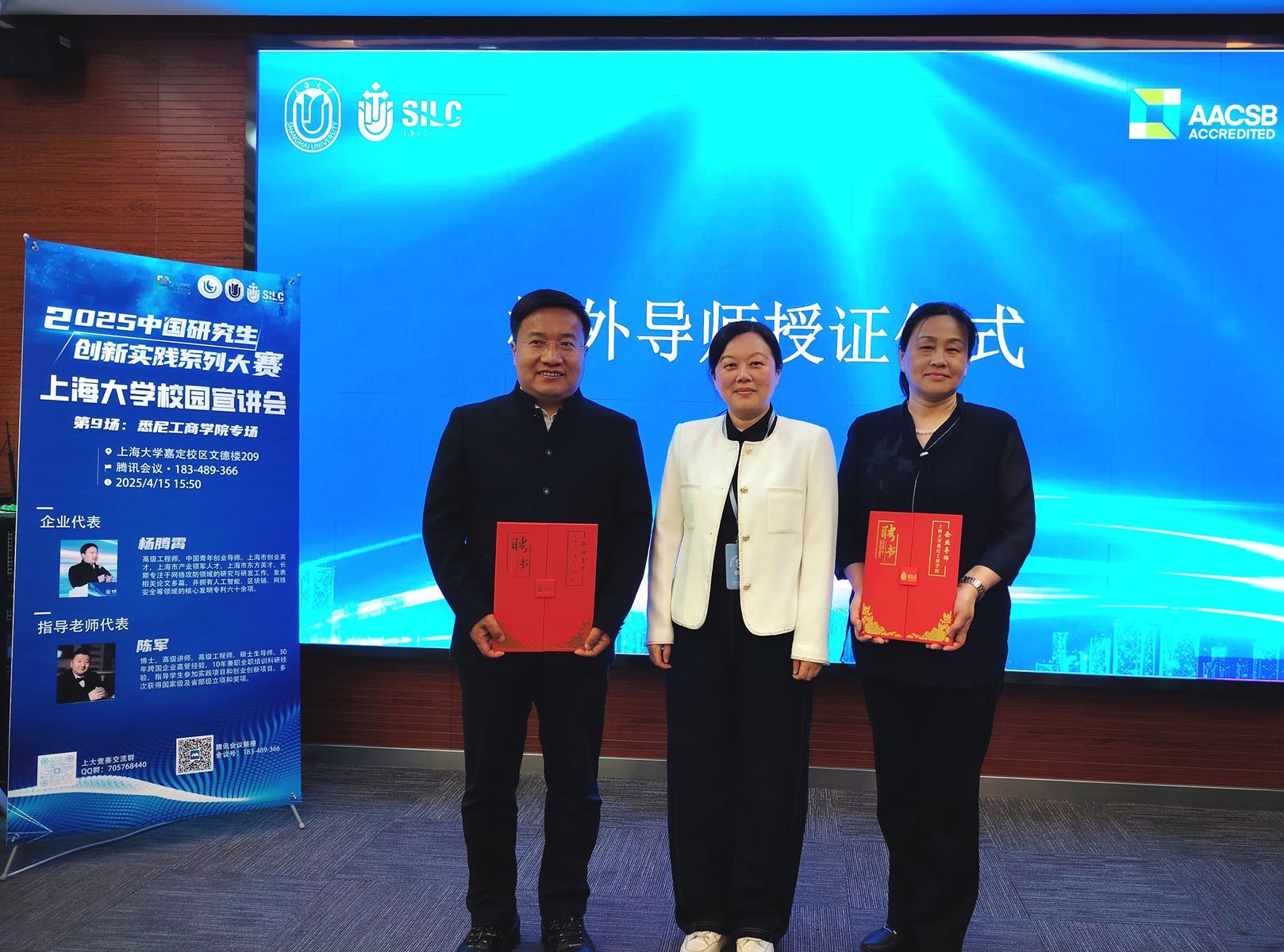 为进一步完善研究生培养体系,学院积极引入社会力量。本次活动特别设置校外导师授证环节,方慧副院长向校外导师陈明艺、杨腾霄颁发聘书。