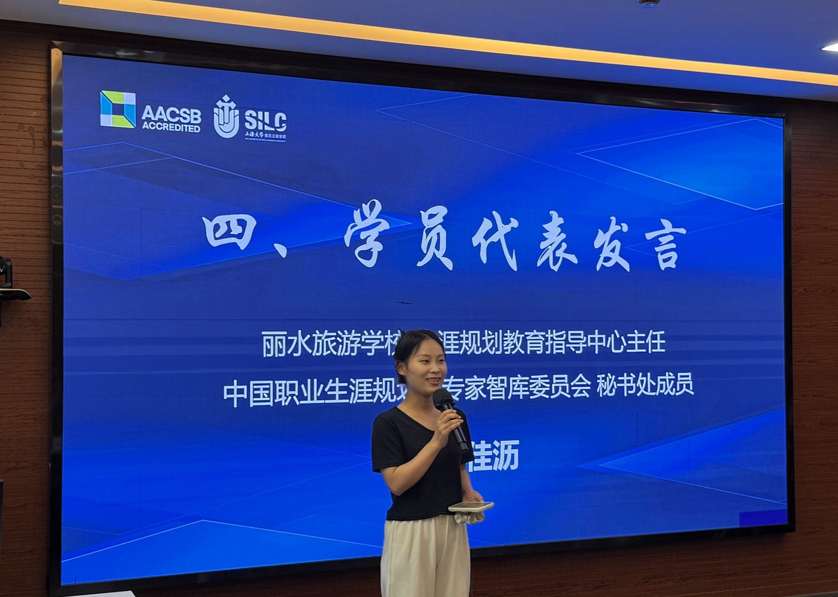 学员代表赵佳沥上台发表了她的结业感言。她深情地回顾了这段意义非凡的学习旅程,细致入微地分享了自己在研修班中的深刻收获与真挚感悟。她表示,通过这段时间的系统学习与深入交流,自己不仅视野得到了极大的拓宽,管理能力也实现了显著提升。更为珍贵的是,她结识了一群志同道合的伙伴,共同度过了这段难忘的时光,收获了深厚的友谊与宝贵的人生经验。她对未来满怀信心与憧憬,决心将所学所得积极应用于实际工作中,为企业的发展和社会的进步贡献自己的一份力量。