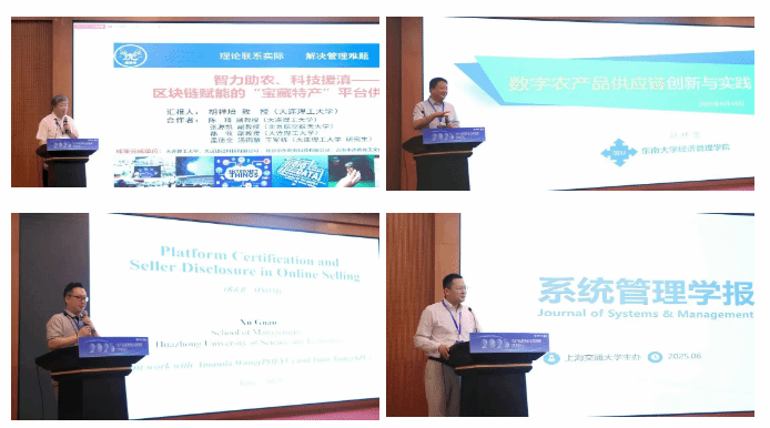 特邀报告阶段,大连理工大学胡祥培教授、东南大学赵林度教授、华中科技大学关旭教授和上海交通大学罗俊教授分别作了精彩报告。报告题目依次为:“智力助农、科技援滇——区块链赋能的宝藏特产平台供应链研究”、“数字农产品供应链创新与实践”、“Platform Certification and Seller Disclosure in Online Platform”与“系统管理学报:助力青年学者交流与成长的平台”。本环节由杭州电子科技大学雒兴刚教授、英国365上市公司孙燕红教授分别主持。