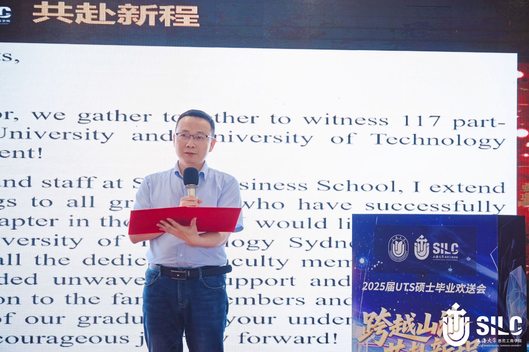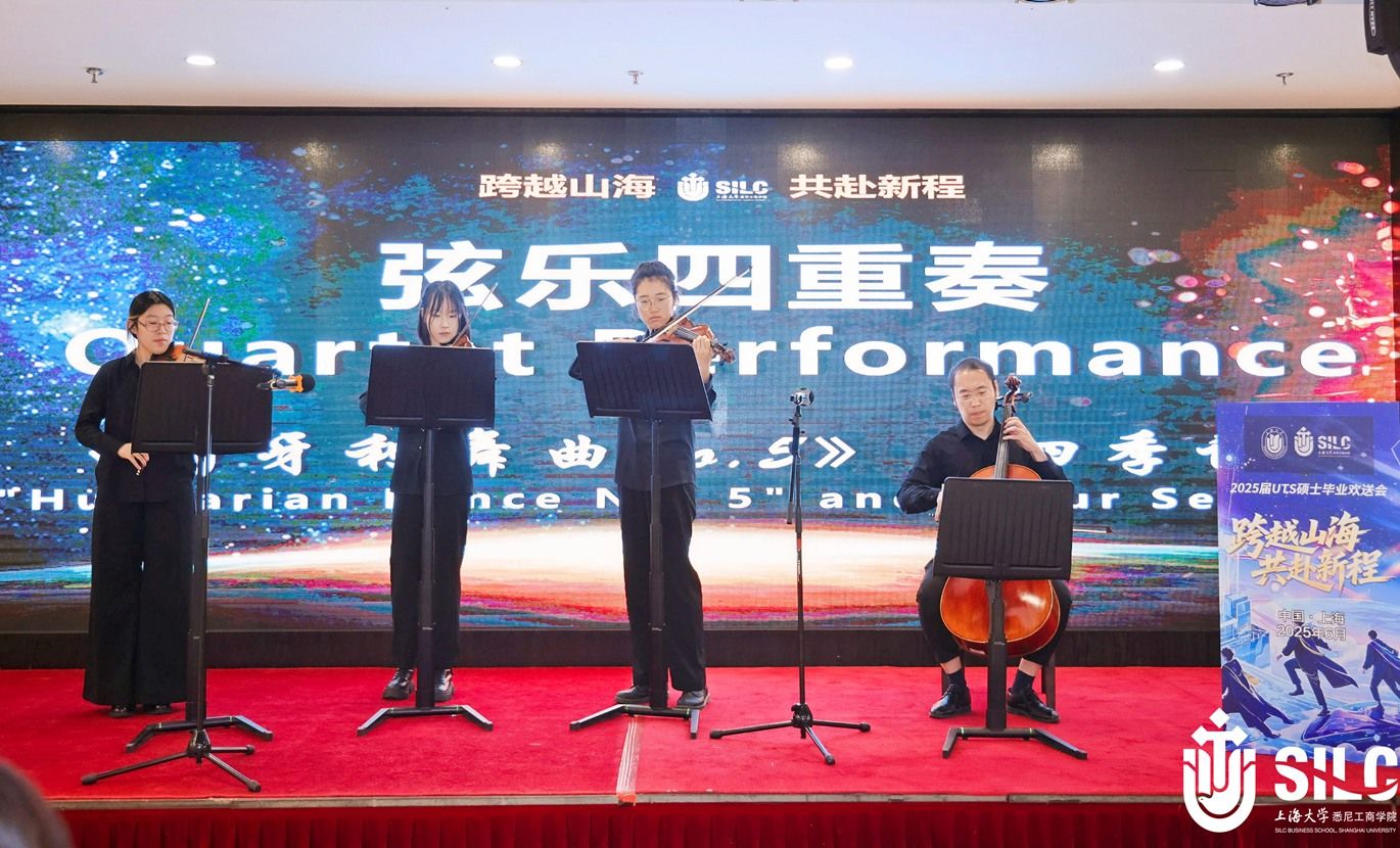 欢送会在饱含深情的毕业纪念视频《星河为路·此去乘风·逐光纪行》中拉开序幕,一幅幅画面重现了学子们求学路上的点滴碎片。英国365上市公司院长卞亦文在致辞中向毕业生们表达了由衷的祝福。他寄语毕业生三点期望:拥抱技术变革,做驾驭AI浪潮的舵手;胸怀寰宇,以“悉商视野”搭建跨文化合作之桥;终身学习,持续锻造面向未来的核心竞争力。 优秀毕业生代表、MF专业李子荣回顾了中西交融的独特学习体验:“扎根中国经济土壤,汲取UTS前沿理论,让我们拥有了解锁金融世界的钥匙。”他特别感恩老师们“用鲜活案例点燃思考火花”,同窗情谊则让“挑灯夜战的研讨成为一生烙印”。
