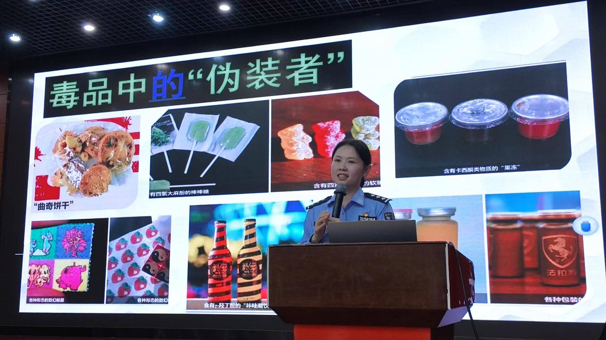 讲座伊始,民警以 “毒品认识” 为切入点,通过 PPT 展示,详细介绍毒品的种类、伪装形态及危害。随后,民警聚焦 “毒品的危害”, 从个人健康、家庭幸福、社会稳定三个层面深入剖析,同时分享多起真实缉毒案例与吸毒人员的悲惨经历。触目惊心的案例让学生深刻认清毒品的严重危害,进一步筑牢远离毒品的思想防线。