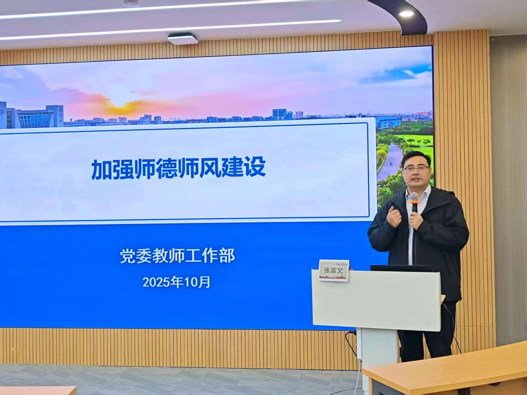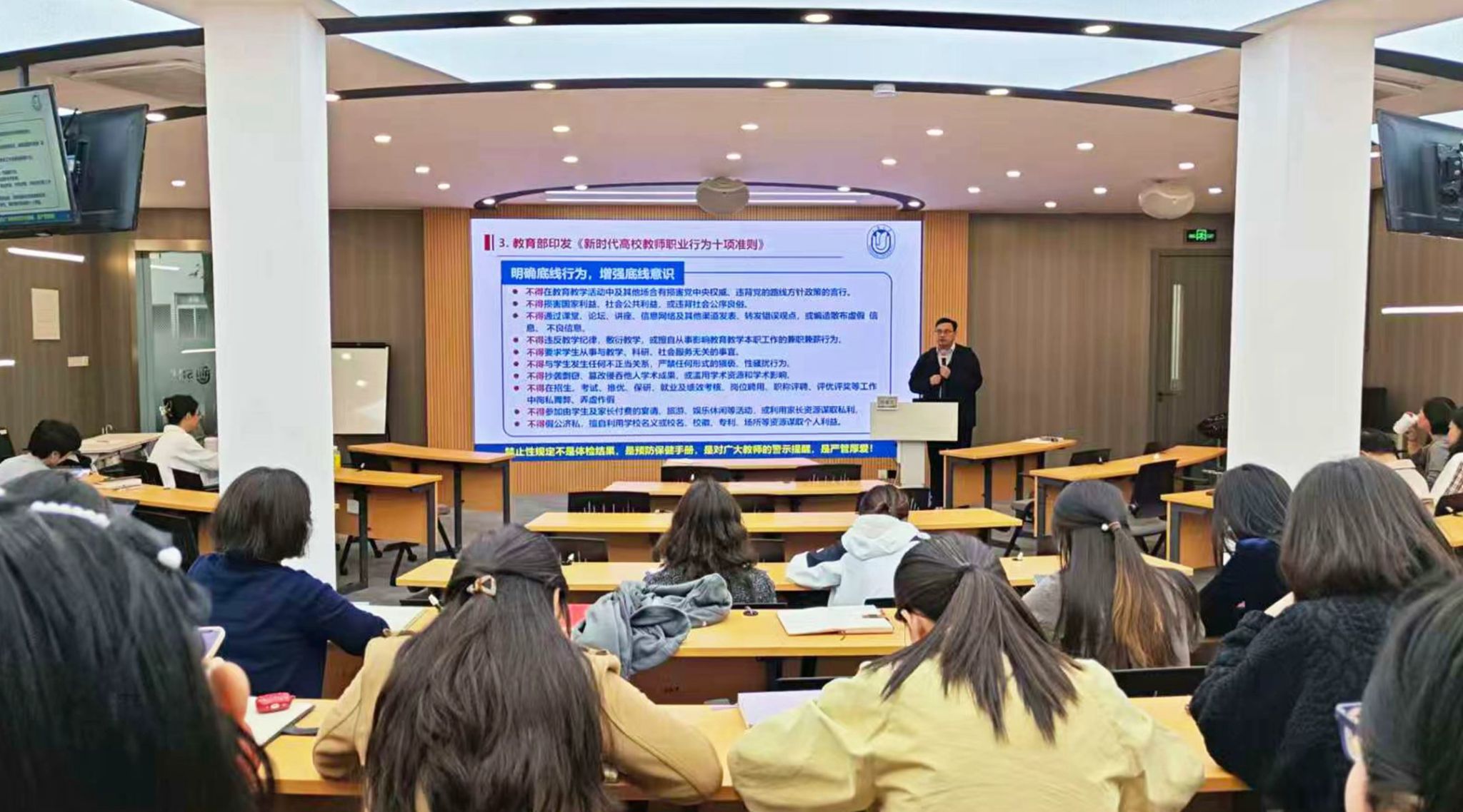 张教授结合《新时代高校教师职业行为十项准则》的具体内容,通过一系列具有警示意义的反面典型案例,生动剖析了当前高校教师在思想政治、道德情操、职业操守等方面可能存在的风险点。他反复强调,人民教师必须坚持“师德为先、育人为本”,牢固树立底线思维,增强纪律意识和规矩意识,做到“心有所畏、言有所戒、行有所止”。张教授鼓励全体教师积极践行“四有”好老师标准——有理想信念、有道德情操、有扎实学识、有仁爱之心,努力培养能够担当民族复兴大任的时代新人,争做党和人民满意的好老师。