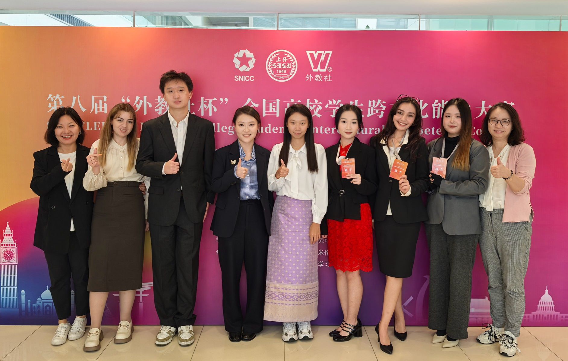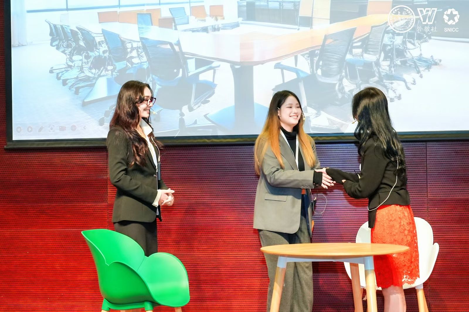 今年8月23日至29日学院开启线上视频初赛,于9月17日进行线下情景述评复赛。经过两轮选拔,中国学生黄凡宸、倪紫嫣、崔子优,以及国际留学生JibinI Misheel、Tursyn Suraayat、Yoshikawa Sachi共六位同学脱颖而出,代表学院参加上海赛区复赛与决赛。团队成员背景多元,涵盖研究生、本科生和Pathway学生,来自中国、日本、蒙古和哈萨克斯坦四国。我院英语系组建中外教师指导团队,旷群、罗伟与Tuscany, 牺牲自己宝贵的休息时间,从案例文本撰写、跨文化理论基础、案例舞台展示设计等多方面精心指导,帮助比赛队员备赛。不仅如此,外国教师Paul Mills也在剧本演绎过程中给出许多建议,并在比赛日主动前来加油。 复赛分为案例展示分析与名言名句解读两部分。面对上海市29支高校队伍,三位中国学生沉着应对,生动再现商务场景与谈判冲突,精准回应评委提问,展现出扎实的理论功底与跨文化理解。在名言解读中,他们结合中外实例与个人经历,呈现了深刻独到的见解。决赛环节包括知识问答、情景述评与讲述中国故事。负责问答的队员用自己丰富的知识储备打出开门红;情景述评阶段三位队员则争分夺秒分段落、写讲稿、作分析;最后的中国故事环节,我院队员才思泉涌妙笔生花,手持大纲在台上绘声绘色讲述着一个个让国人为之自豪的优秀摹本,赢得评委与观众的一致好评。