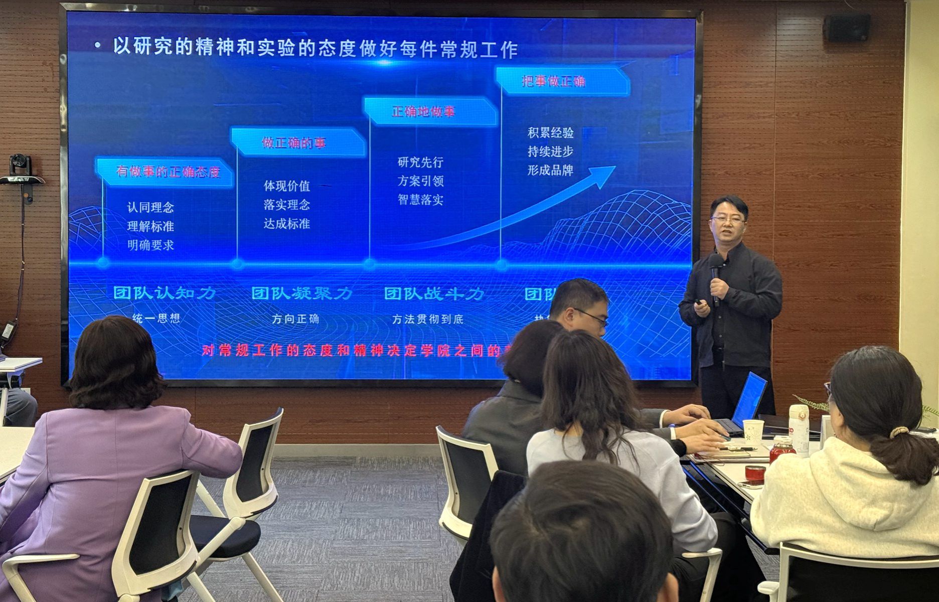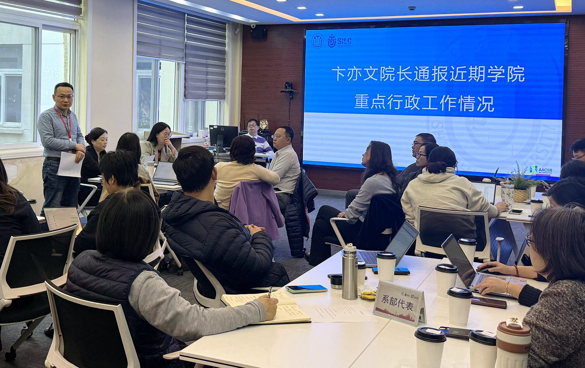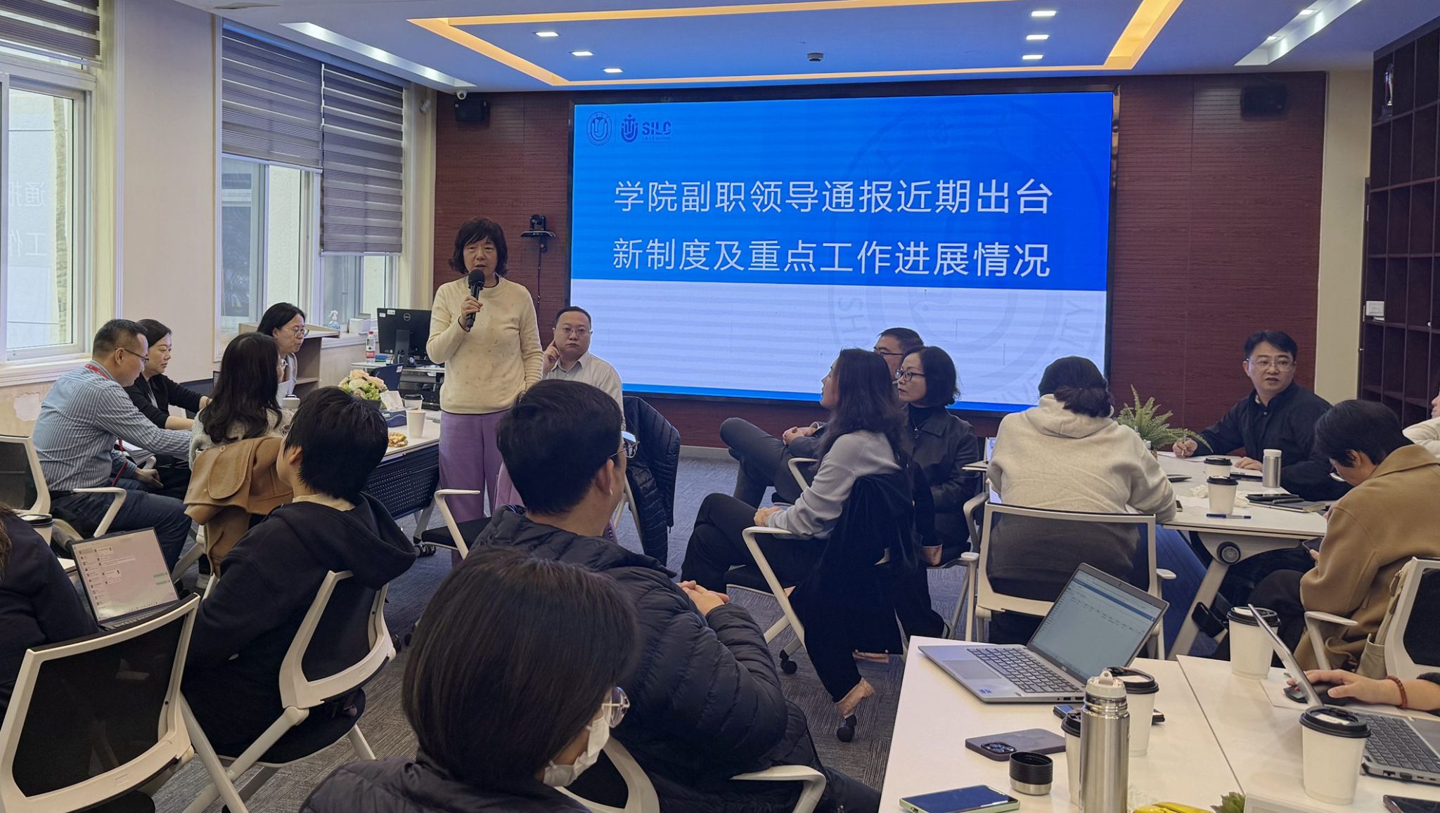 行政部门述职会上,学院办公室、创新管理部、对外联络部、国际部、教学管理部、市场发展部、学生工作部、研究生管理部等八个学院行政部门的负责人依次进行了部门工作年度述职,详细汇报了各部门一年来的主要工作特色和取得的重要成果,对新一年的工作提出了初步设想。 秋季学期院务会议上,卞亦文院长通报了学院PATHWAY项目招生政策的新进展,要求各系部在年末做好年度总结及新一年规划工作,并从学院办学高质量发展的角度出发思考学院“十五五”规划。