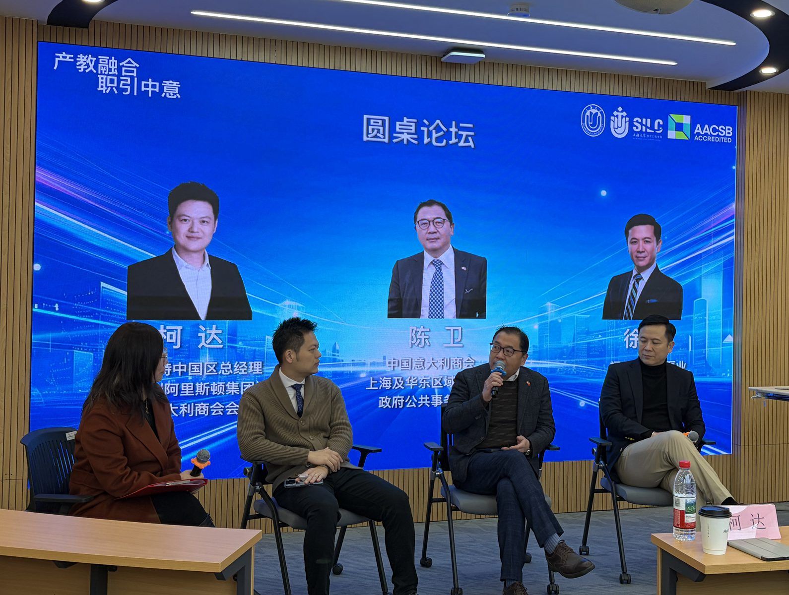 随后,三位嘉宾围绕外企人才需求与职业发展路径展开深度分享。柯达凭借多年外企高管经验,指出外企必须深入融合本地文化、人才与市场才能持续发展。他建议同学们在校期间加强语言能力,除英语外可适当学习意大利语、德语等工业强国语言,同时培养跨文化沟通与实际问题解决能力,为未来进入外企做好准备。徐皓以所在意大利家族企业为例,分享了企业在华战略与人才观。他表示,意大利企业重视员工的价值贡献与文化认同,招聘时不仅关注英语能力与专业背景,更青睐自信主动、具备解决问题意识和可塑性的人才。陈卫从意大利商会视角,分析了在华意企的人才需求与产教融合方向。他介绍,意大利在华企业覆盖机械制造、医疗器械、奢侈品、物流等多个行业,超八成属于家族企业。这类企业重视员工与企业文化的匹配度,并为认同其价值观的员工提供长期发展通道。