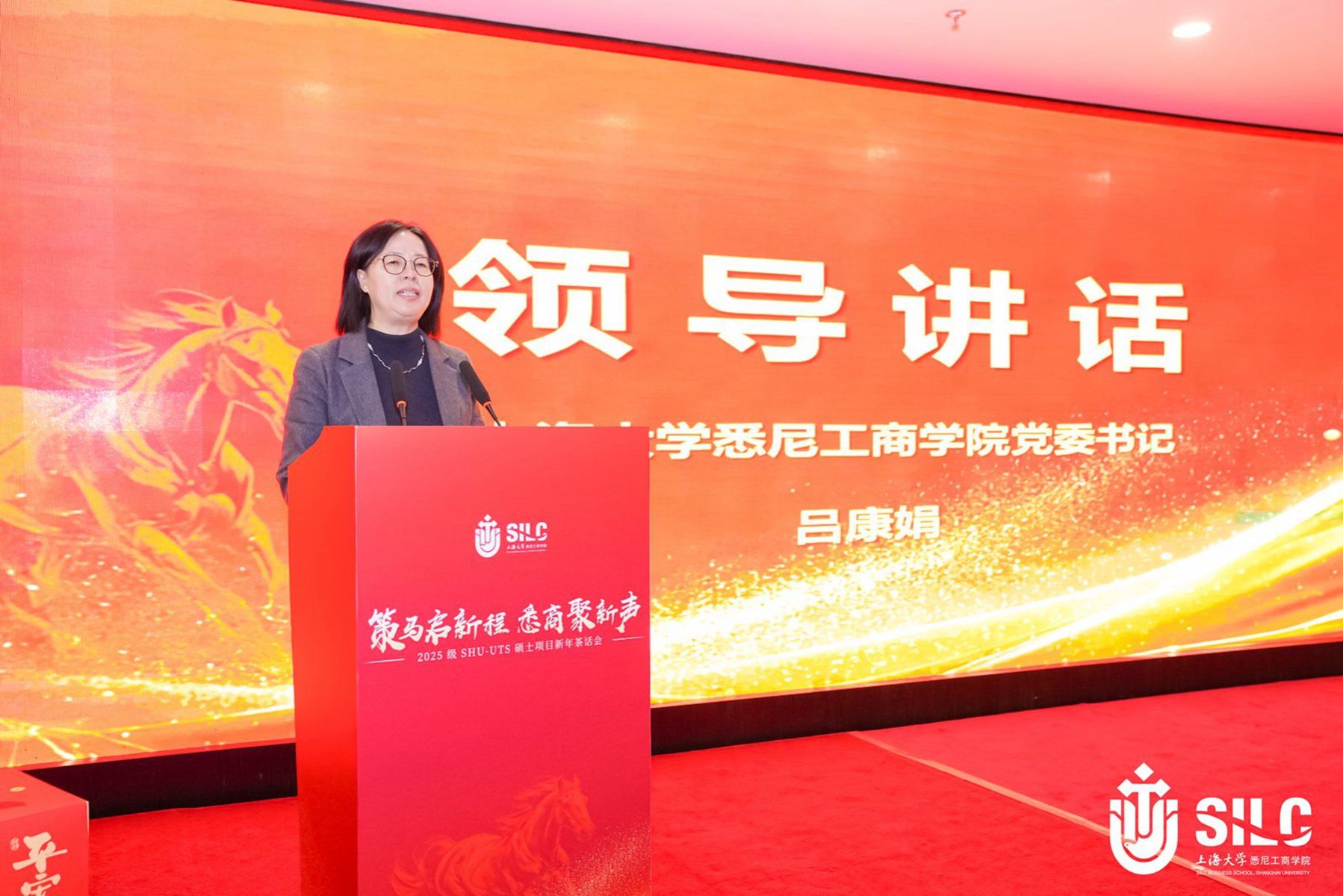 活动在悠扬婉转的暖场音乐中缓缓拉开序幕。致辞环节,学院党委书记吕康娟向全体师生致以诚挚的新年问候。她回顾了SHU-UTS硕士项目“连接中外、赋能成长”的办学历程,并勉励大家在新的一年中珍惜时光、携手同行,在跨文化的学术环境中不断成长、共绘未来。