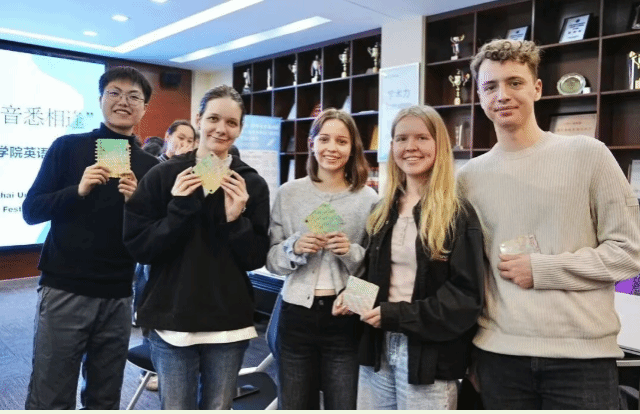 卫静芬、旷群、顾浩东共同上台,宣布2025-2026学年英国365上市公司英语文荟节正式启动。 清韵寄怀,心通四海。启动仪式后,现场开展了“竹韵绕指,情连中外”中外师生竹编文化体验活动。中外师生首先自主选择喜爱的杯垫图案,随后分组就坐,之后在学生会素质拓展部同学的细致讲解与指导下,动手编织,通过穿篾、交织的手工实践,沉浸式感受中国传统竹编技艺的精巧与匠心,在协作互动中传递跨文化情谊,近距离体验中华非遗文化的独特魅力。活动最后,全体领导、嘉宾与师生代表共同合影,举起手中的竹编杯垫,定格下了这一美好时刻,正式拉开了本届英语文荟节的华彩序幕。