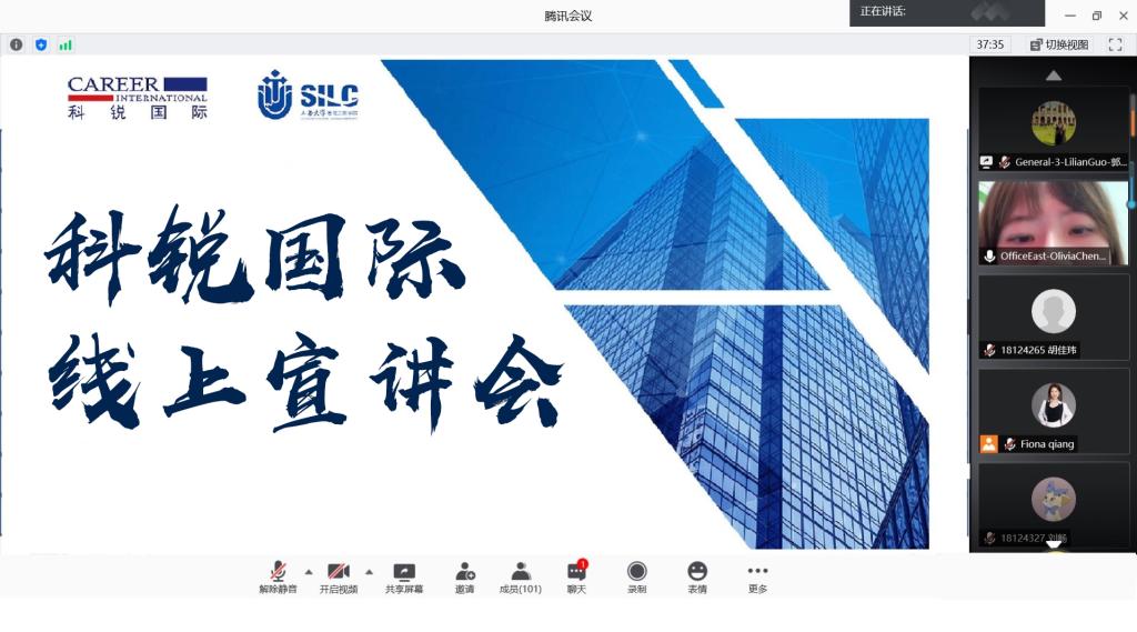 2020年9月18日下午2点,科锐国际线上宣讲会活动如期举行,本次活动采用线上视频会议形式,让同学们近距离参与到校企宣讲会中,吸引了103名学生参与。通过企业展示人员的分享,同学们对于科锐国际公司的合作人才培养模式、未来职业发展方向规划等方面都有了更加深入的了解。此次宣讲会由科锐国际招聘团队的Olivia Chen主讲,同时Lilian Guo和Fiona Qiang 就公司人才培养机制等方面进行了补充。