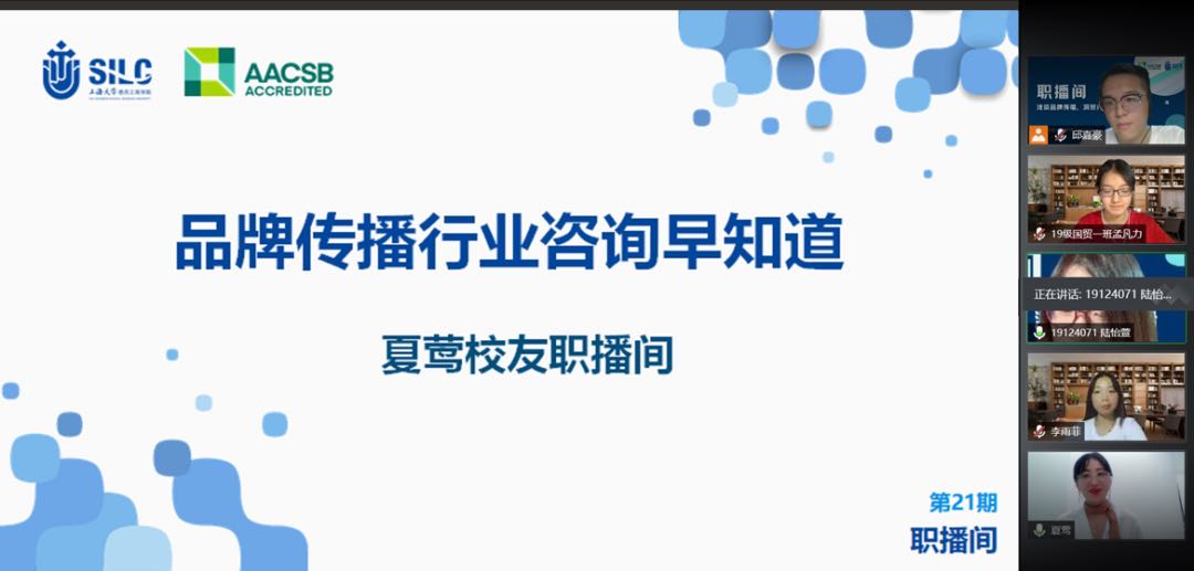 2020年9月26日晚8点,第二十一期职播间线上分享活动准时开始,本次职播间依旧采用互动性强且直观的视频会议形式,与校友“面对面”沟通。随着时代的转变,企业已经不再是单独的个体,它们面对着各种各样的客户群体,如何更有效建立并稳固维持与消费群体的关系俨然成为了当今社会的一大关注点。因此,本次职播间荣幸邀请到了现任上海赋星文化传播有限公司的总经理,亦是1994级国际贸易与英语专业的悉商校友夏莺,在腾讯会议中为同学们做了为时一个半小时的直播分享,共有27名同学参加。