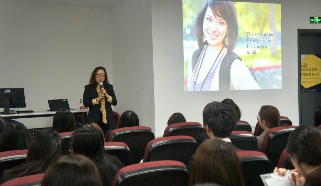 宣讲会上,陆锡玳首先为大家介绍了安永的基本情况,目前安永在北京、香港、上海、广州等全国二十九个城市都有设立办事处。她表示,安永有四大业务部门,包括风险管理、内部审计、信息科技风险以及网络安全,所以无论同学们在大学期间学习的是什么专业,都有机会进入安永,经过企业内部的专业培训后掌握相应业务能力,并很快融入这个大家庭。陆锡玳以安永今年启用的可以完成数学分析以及AI的服务财务机器人为例,展现了财务业务与科技的良好结合。