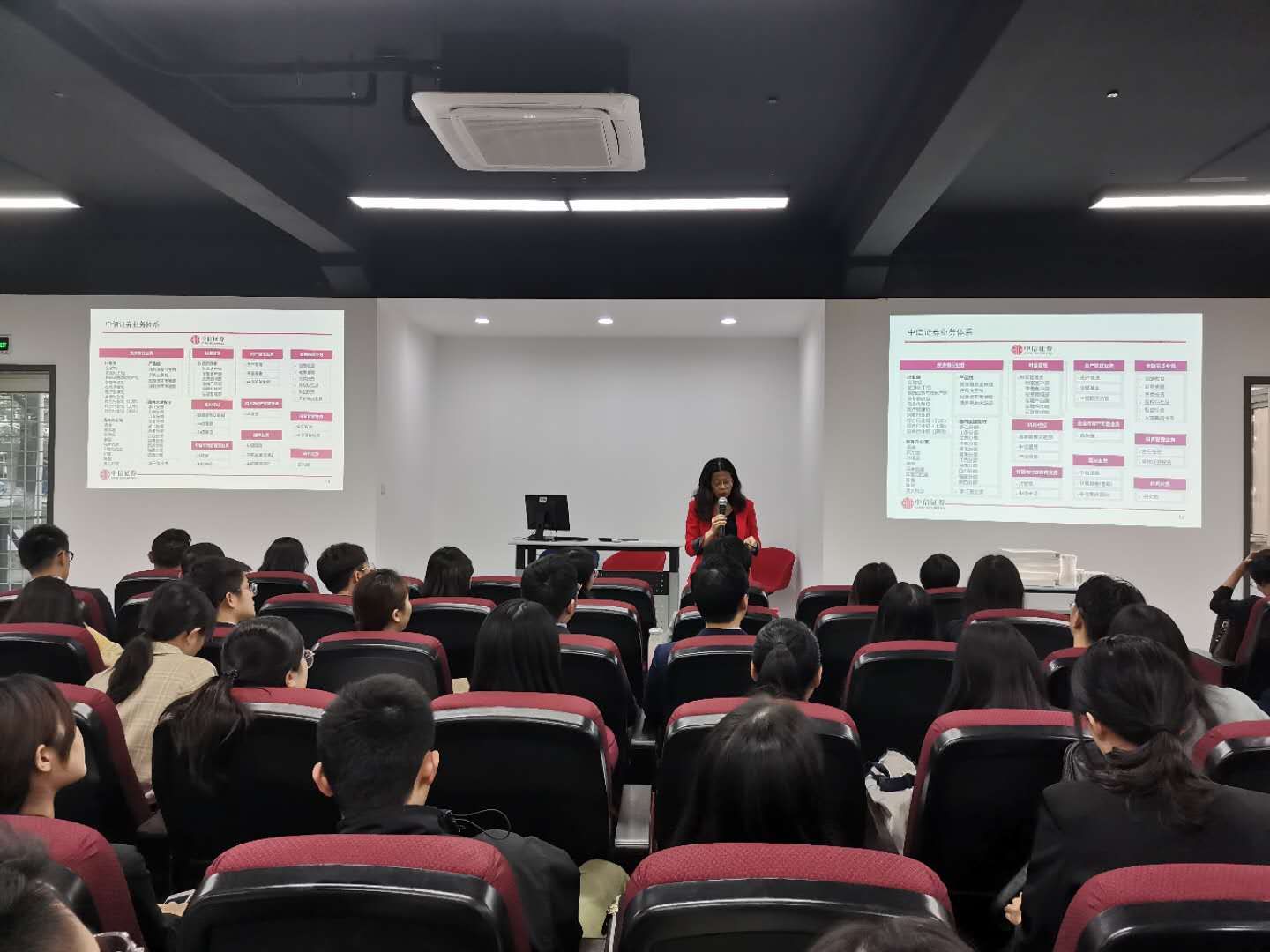 紧接着,汪丽华为在场学生介绍了中信证券的基本情况和发展历程。中信证券拥有32个部门及业务线包括投资银行、财富管理、资产管理、金融市场、投资管理、资金与资产配置业务等。主要一级子公司7家,全系统员工总数1.8万人,分支机构遍布全球13个国家和地区,全国31个省、自治区、直辖市。上海区域的重点客群包括零售和财富业务、专业投资机构和一般法人与政府机构。“持续收购+新业务创新”是中信证券始终坚持的发展理念,强调了证券行业中创新能力、国际化和并购融合的重要性。