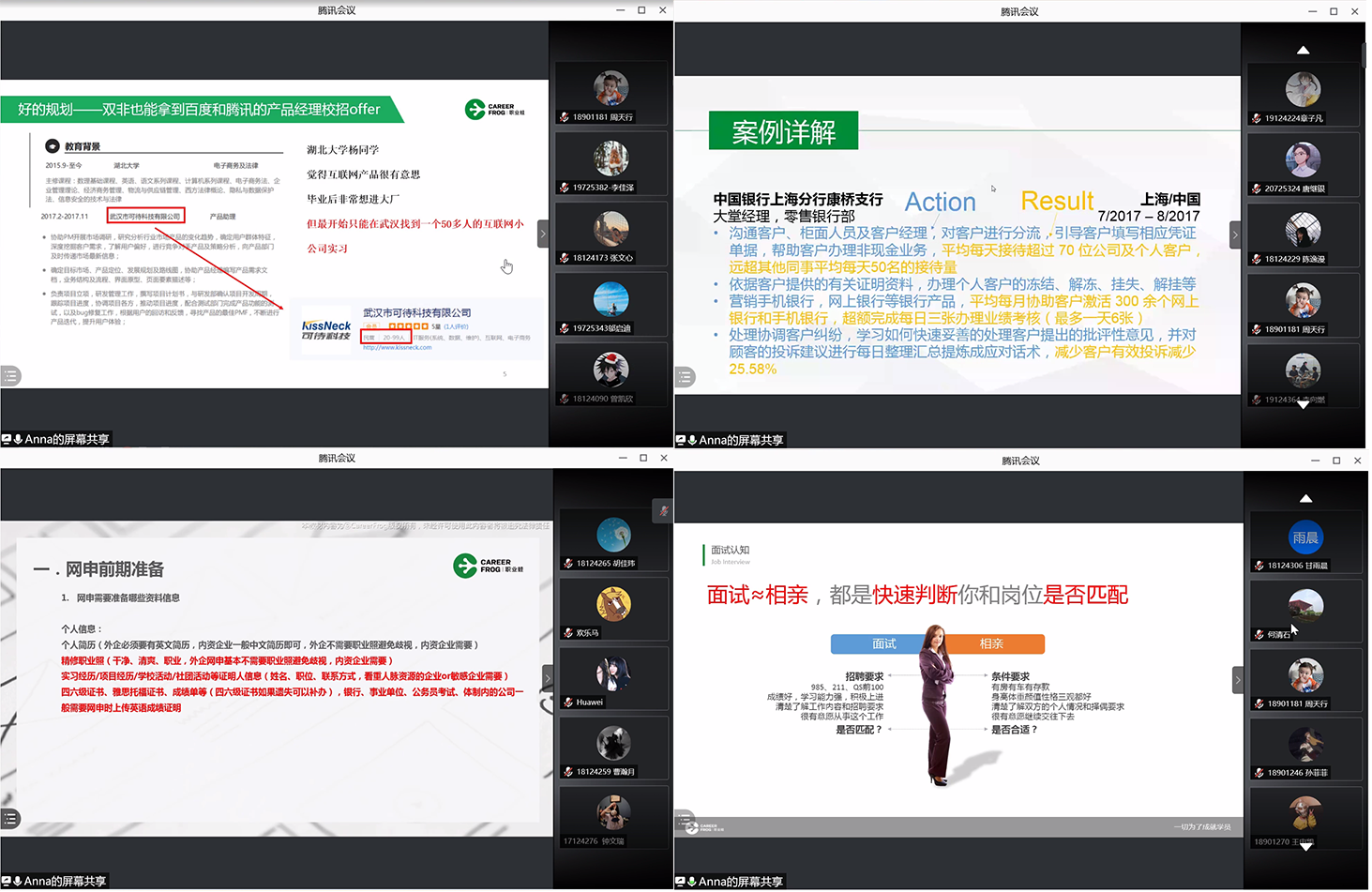 2020-2021学年冬季学期,“职”等你来求职专题讲座以线上形式在腾讯会议进行。讲座共四期,分别为职业规划、简历制作、网申与笔试、群面与单面,旨在为在校学生提供求职相关的知识普及与技能指导。本次活动邀请了学院学生职业生涯规划发展平台合作单位职业蛙的职业生涯高级讲师杨倩婧主讲,四期讲座总计参与数量达200余人次。