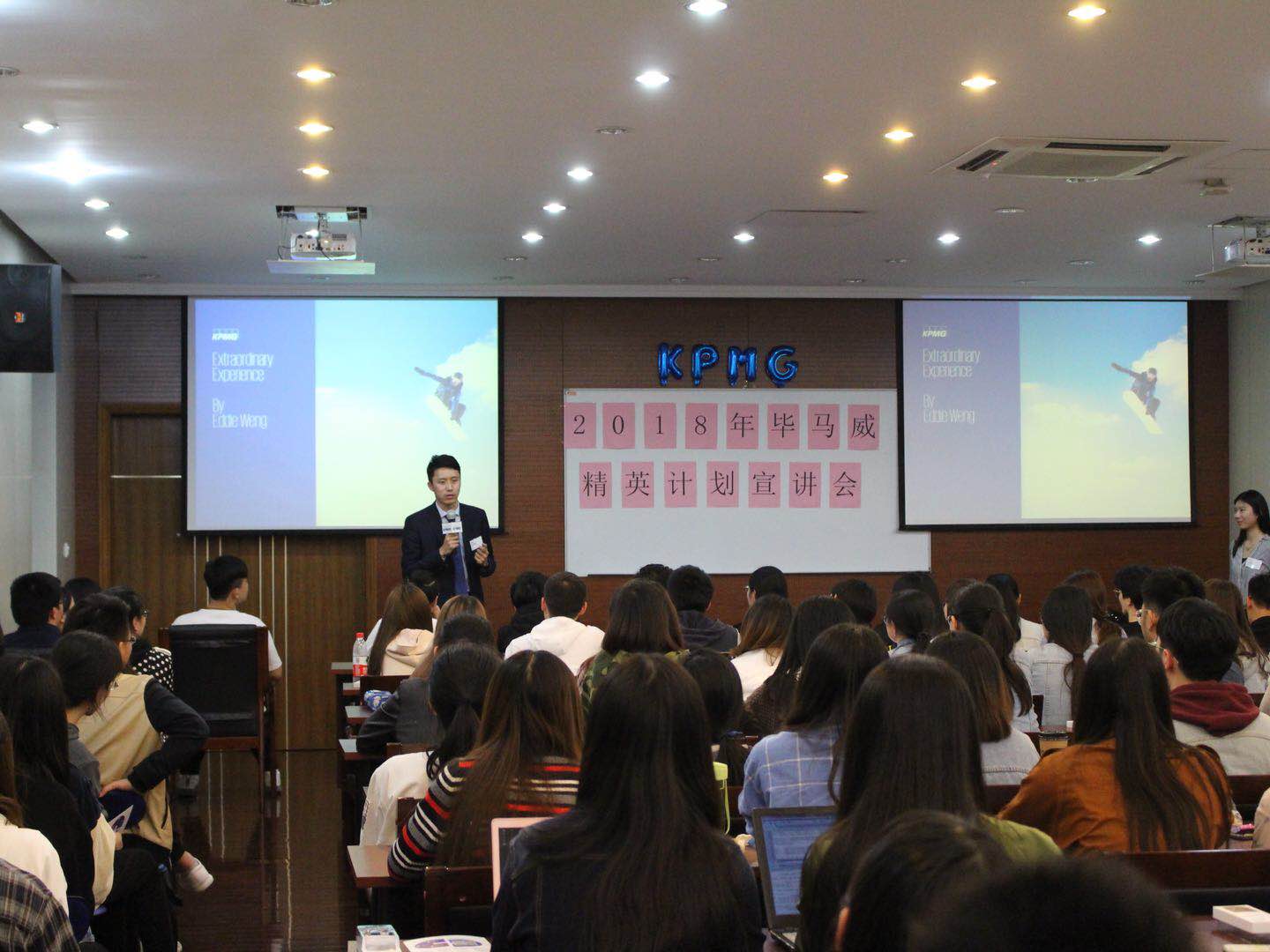 2018年4月9日18:00,毕马威精英计划校园宣讲会在文德三楼报告厅举行,吸引了来自悉商、其他学院以及外校的150多位优秀的学生。本场毕马威精英计划宣讲会分为5个环节由人力资源部门的Joyce Cai和April Yu开场,详细介绍了精英计划的项目内容,接着毕马威审计部门Eddie Weng分享了他在KPMG工作的感受和体验,之后精英计划的成员Cathy Tang和Dennis Yan分享他们在精英计划的成长,Q&A环节合伙人Eddie Weng、招聘经理Johnny Wang以及毕马威的出席成员一起回答了同学们的疑惑。