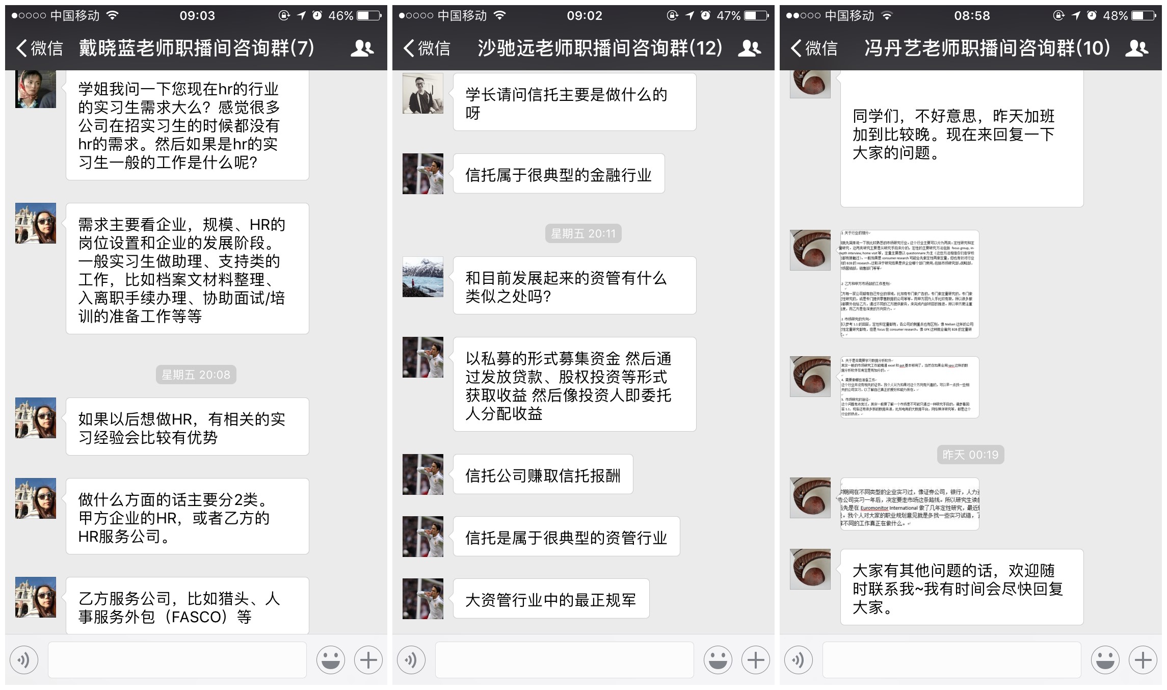2017年3月24日晚八点,第二期“职播间”线上讲座活动成功举办。本次“职播间”活动邀请到人力资源管理、金融以及市场研究三大不同职业方向的校友为大家开展讲座,共计23名同学通过前期报名积极参与到本次活动中来。通过和校友的线上近距离接触,同学们纷纷向校友咨询各类问题,积极参与互动。时常一个小时的活动在同学和校友们热烈的讨论中落下帷幕,同学们纷纷表示讲座时间太短,颇有些意犹未尽之感。
