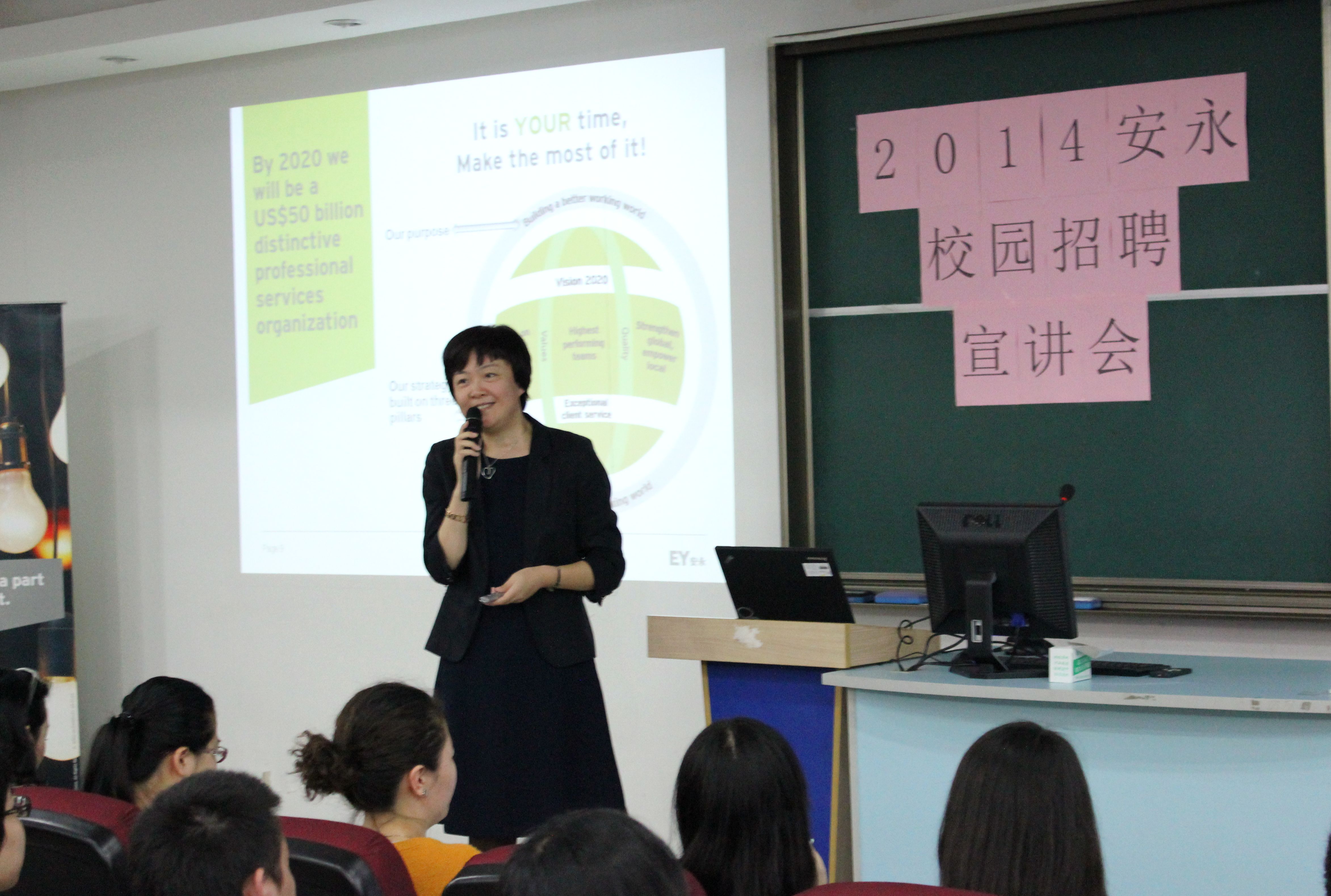2013年9月26日晚上6点30分悉商的校园如同往常一样平静,但在文德楼1楼报告厅里,却有着一场别开生面的报告——2014年安永校园招聘宣讲会。本次的宣讲会主要分为三个部分:安永公司介绍,网申安永的流程介绍以及问答环节。