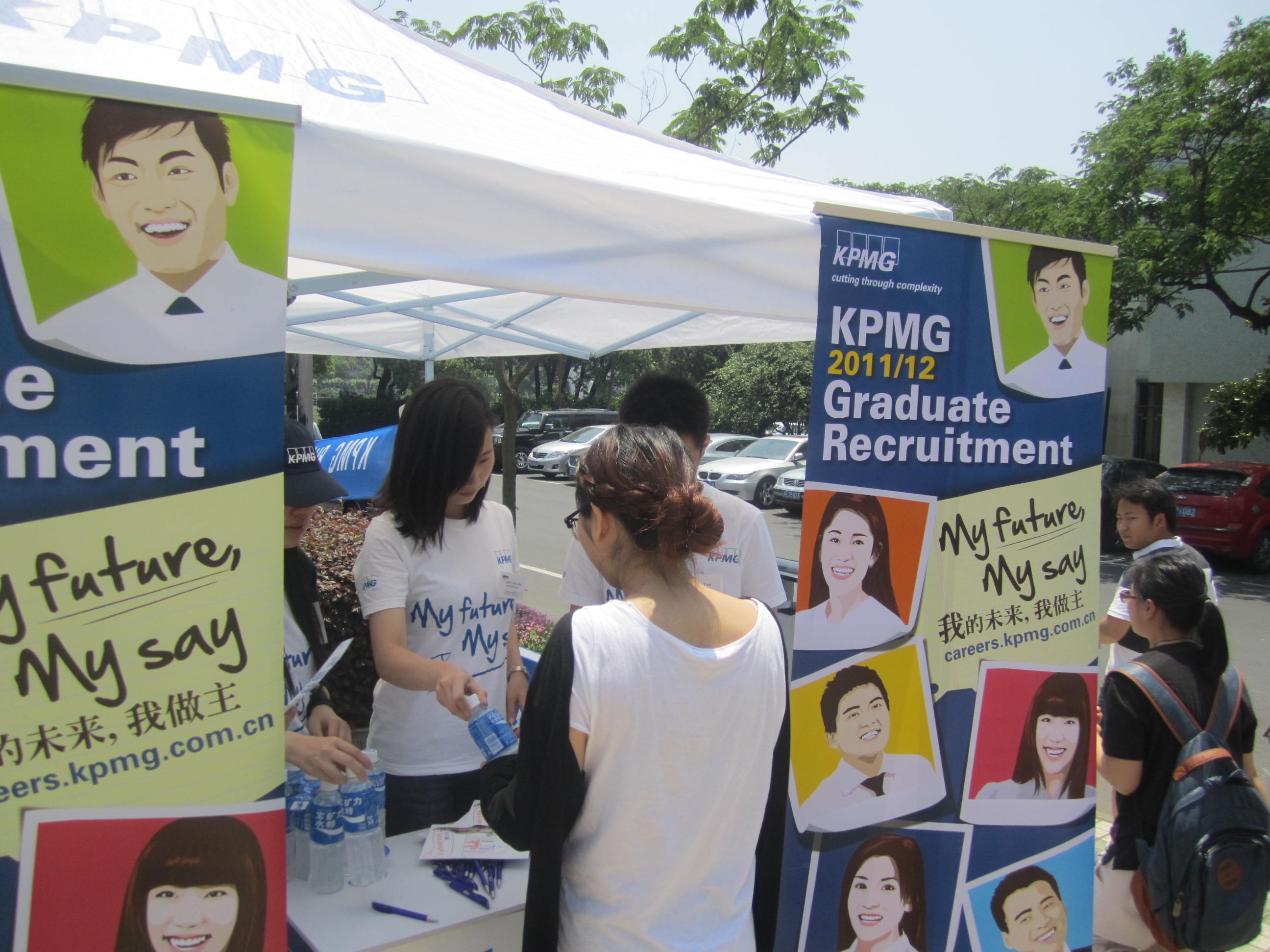 17日上午10点45分,KPMG 与宝特利水特联手早早在一食堂门口搭建了展台。包括Grace、Jerry在内的悉商校友,及其他KPMG同仁也都来到了嘉定校区进行校友回访。活动现场气氛十分热烈,同学们对KPMG有很大的兴趣,并纷纷留下了自己的基本信息。KPMG的工作人员也耐心解答同学的关于四大的各种问题,KPMG还为同学们准备了精美礼品。学院常务副院长张能辉老师、实习就业指导中心曹英老师、曾晓琳老师等也都莅临现场,与KPMG校友进行了沟通交流。