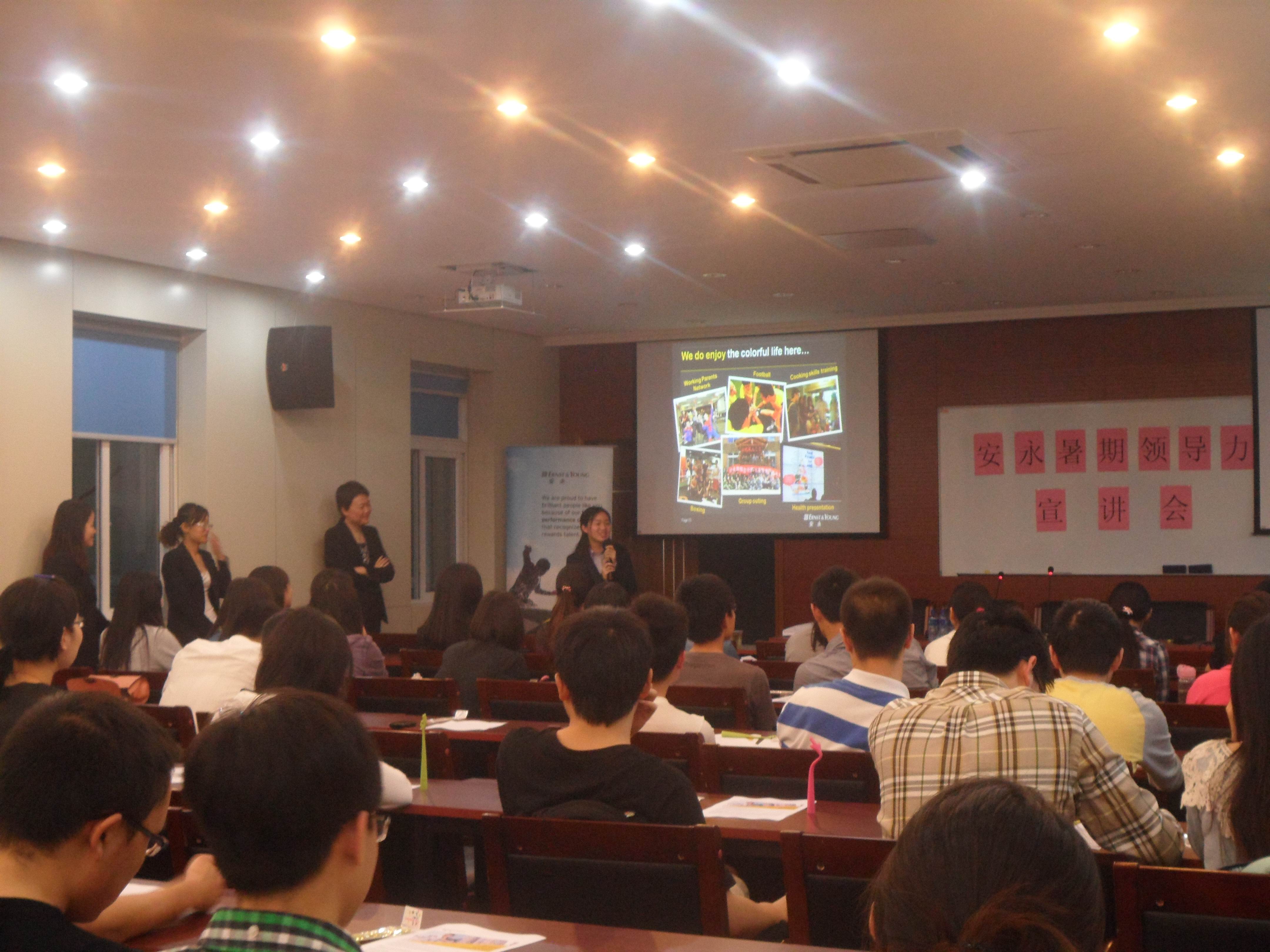2012年5月10日晚六点,安永"暑期领导力"宣讲会在学习中心三楼成功举办。安永的合伙人朱蕾女士、安永税务部经理以及HR部门的工作人员以"Be Yourself in EY"为主题为同学们带来精彩的演讲。