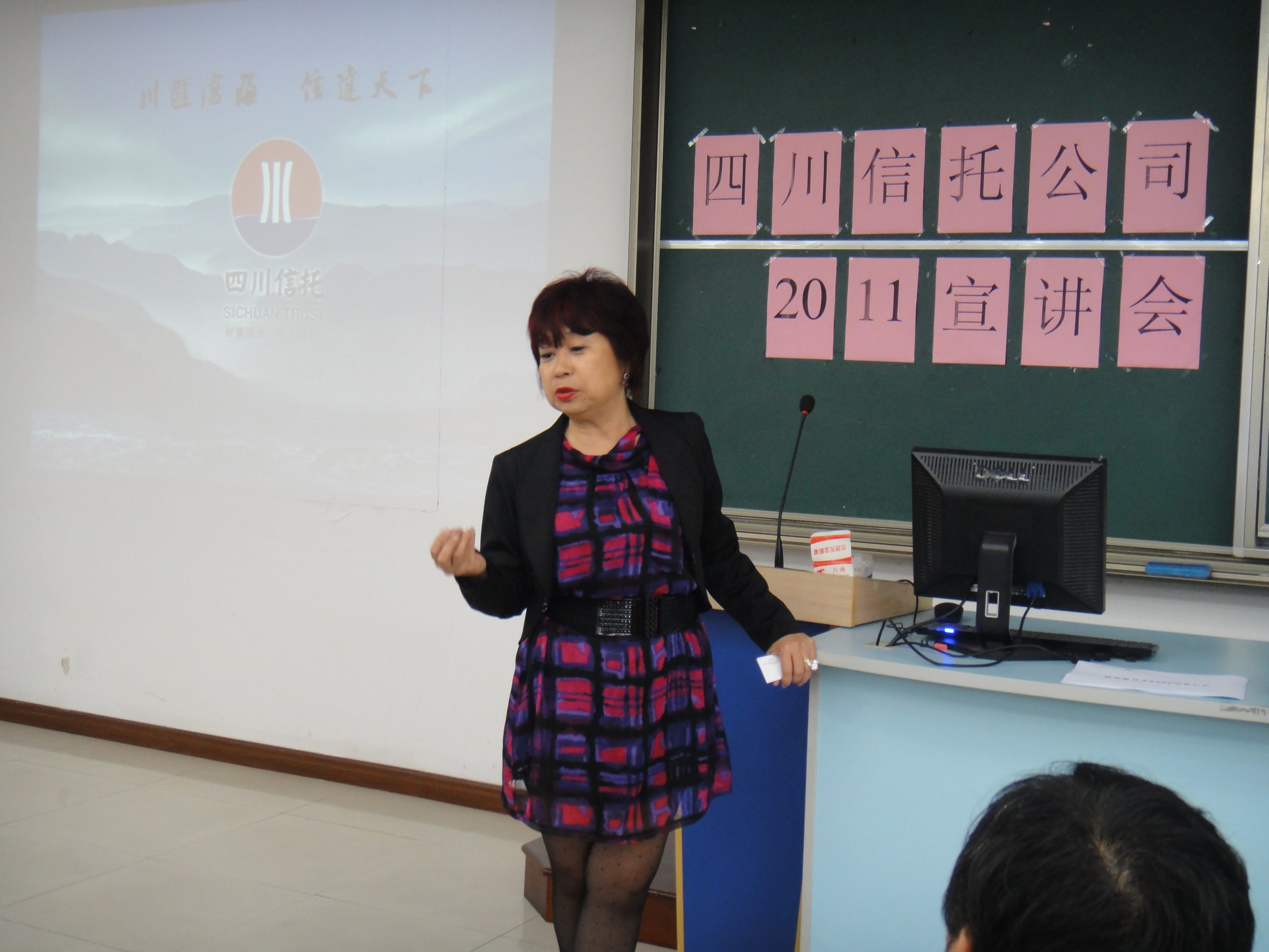 2011年11月2日,四川信托公司宣讲会在实验楼报告厅顺利举行。此次活动邀请了四川信托有限公司上海财富管理中心综合部总监莫惟洵女士。她为现场的同学们讲解了一系列信托行业的相关知识,向大家发布了四川信托有限公司的招聘信息,并与同学们进行了一系列互动。