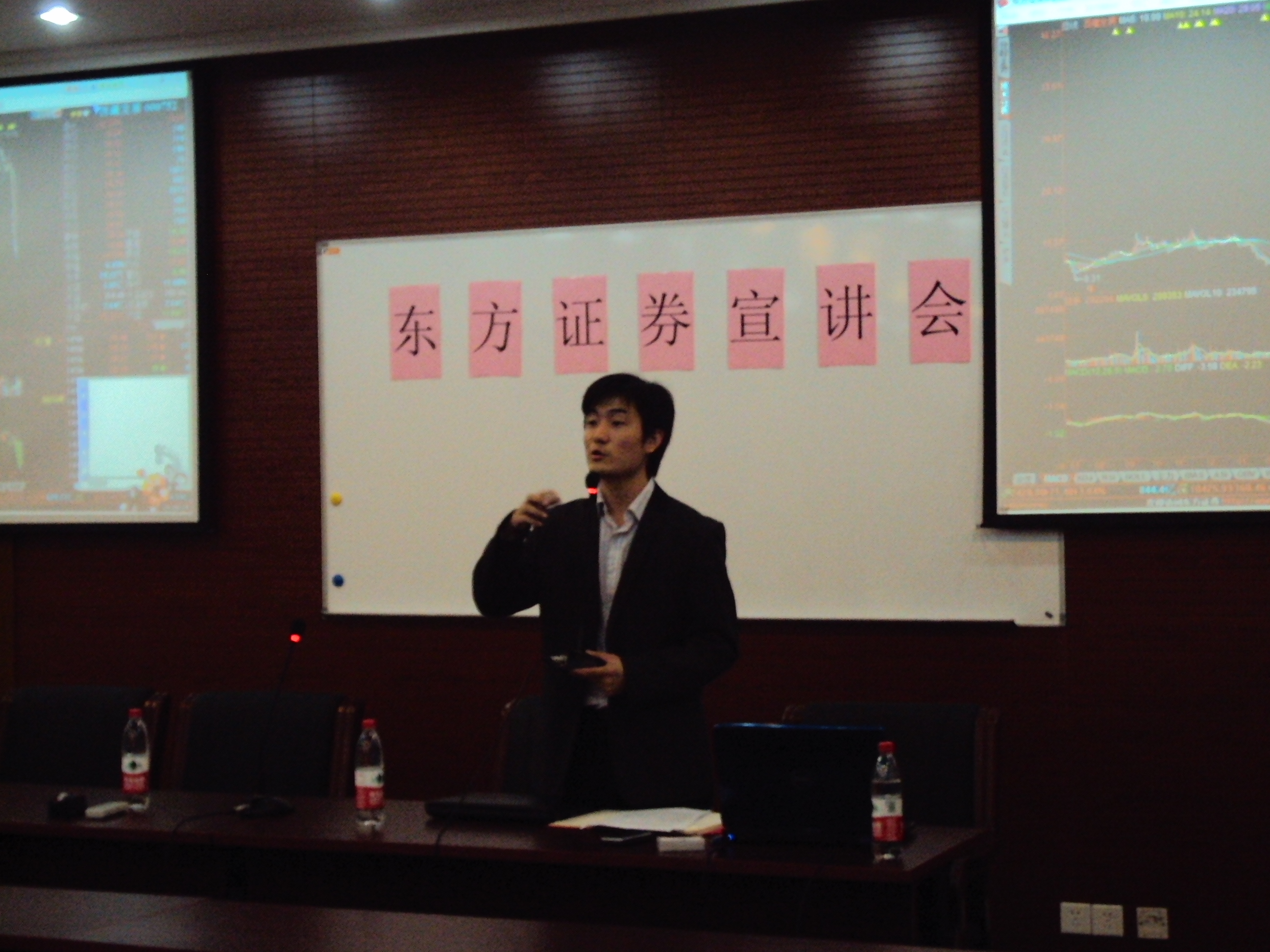 2011年10月12日晚六点,东方证券的高级理财经理陆琛俊在学习中心三楼报告厅为悉商学子带来了一场有关证券业的相关知识及看盘技巧的报告会。东方证券股份有限公司是一家经中国证券监督管理委员会批准的综合类证券公司,其业务品种齐全,涵盖了证券承销、自营买卖、交易代理、投资咨询、财务顾问、企业并购、基金和资产管理等众多领域。该公司还于2010年获得最卓越雇主奖"。此次报告会主要针对现在大学生对证券行业的了解需求,对证券行业的发展史及前景,中国证券行业的现状,个人从事证券行业的发展及看盘技巧进行了解读。