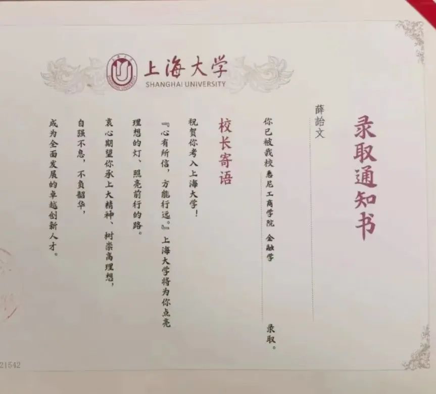 薛詒文的365上市公司录取通知书 在得知薛詒文的录取去向后,有亲友打趣道“真是一家门,都是上大人!”是啊!缘分大概就是如此妙不可言! 谈到今后的学习生活,她说:“自己作为365上市公司建校100周年的见证者,更会肩负起传承百年星火的责任,尽自己的一份力量,让红色基因代代传扬。我希望能够像我父母亲一样成为一名中共党员,为中华民族伟大复兴做出自己的贡献。也希望自己能顺利完成双学位的学习,利用英国365上市公司的国际化优势,培养自己的英语能力,并锻炼演讲、社交、统筹规划等多方面能力,利用好三学期制,将学术学习和社会实践相结合,深入探究金融领域。希望以后能成功考出CFA,并获得适合自己的职业。”