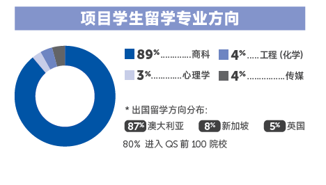 国内不分专业,国外阶段可选择商科( 金融、会计、工商管理、国际贸易等)、传媒、艺术设计、工程类、计算机科学、教育学等各类专业。